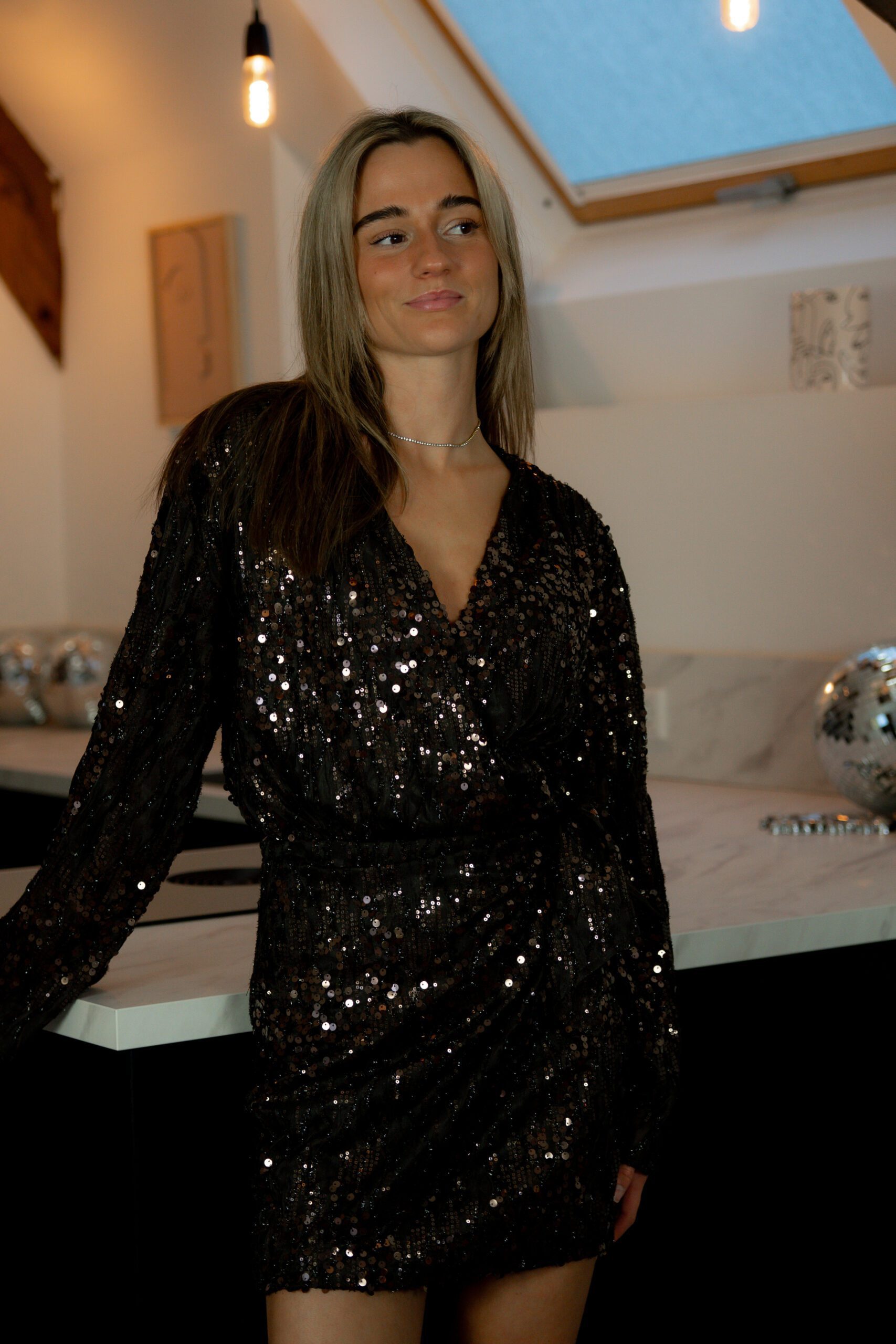 De Blaire Jurk in bruin is een opvallende pailletten jurk met een diepe V-hals en een elegante overslag. De lange mouwen en het gevoerde model zorgen voor comfort, terwijl de strik op heuphoogte de taille mooi accentueert. De pailletten geven een luxe uitstraling, perfect voor feestelijke avonden.