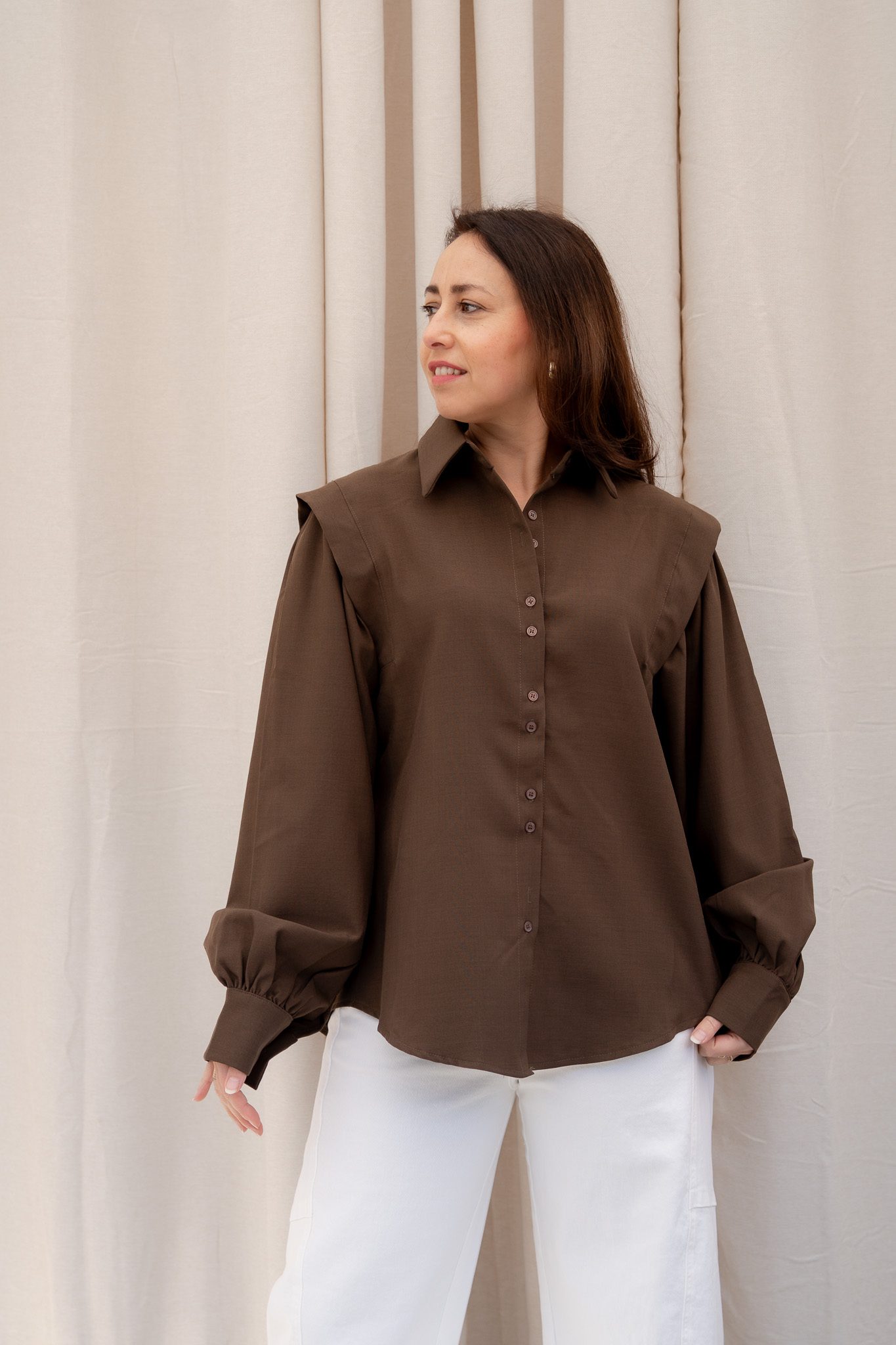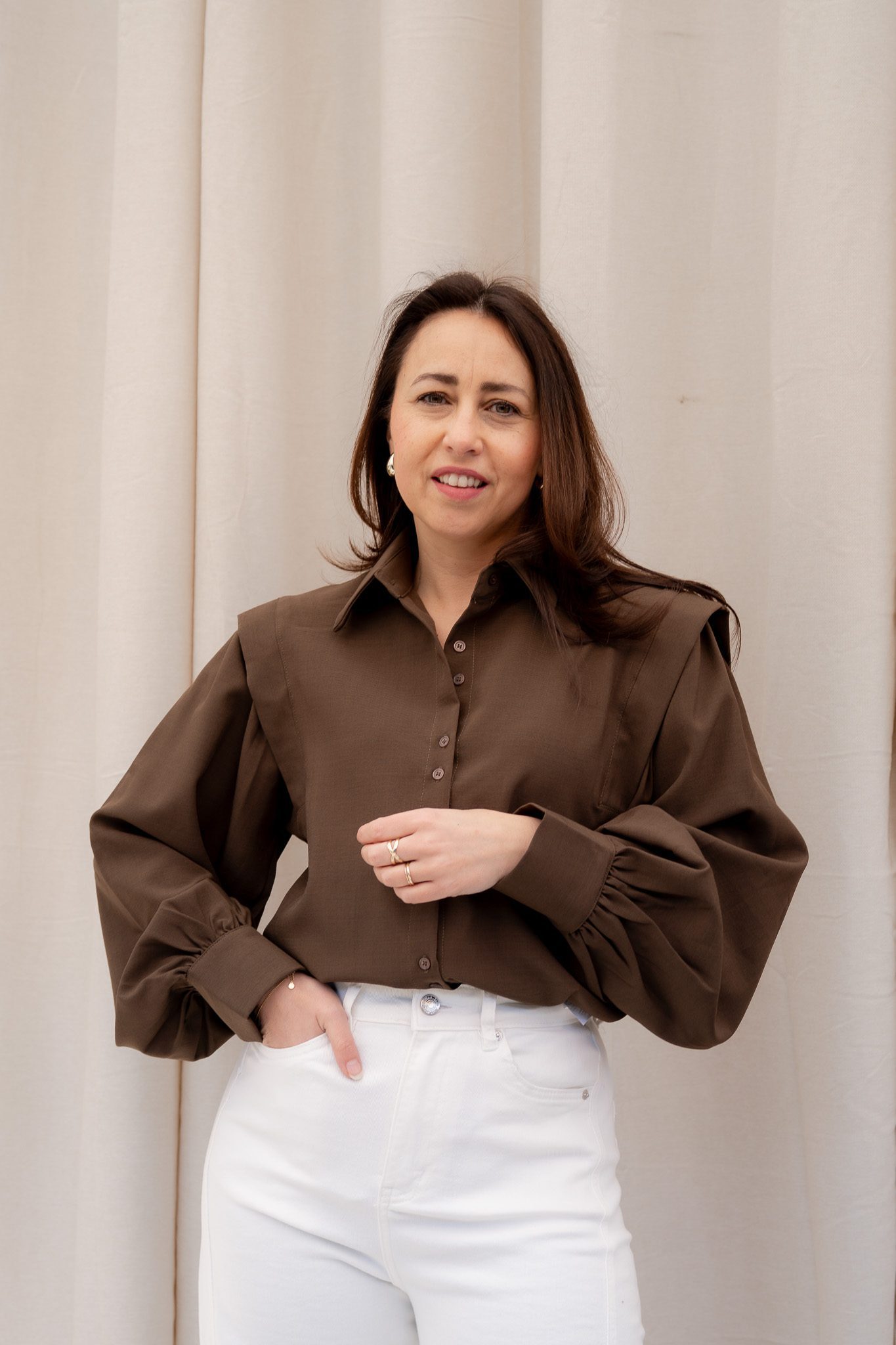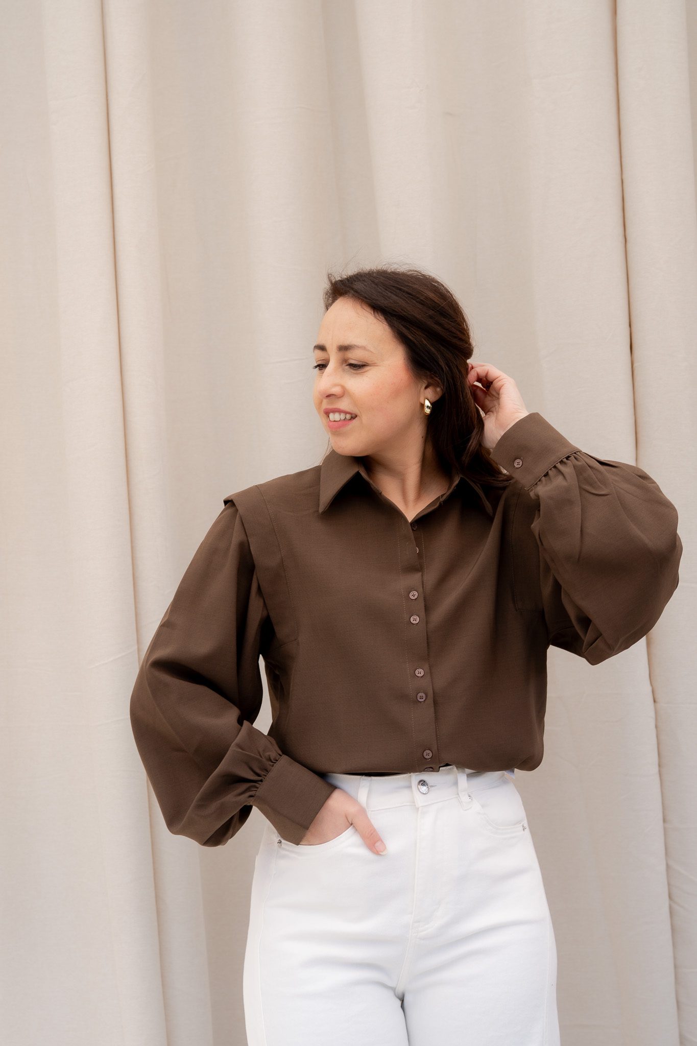 De Bodine blouse in bruin en camel is een stijlvolle eyecatcher met een elegante, vrouwelijke uitstraling. De soepel vallende stof en de volumineuze mouwen geven de blouse een luxe en moderne look. De subtiele plooien bij de schouders en de licht gepofte mouwen zorgen voor een verfijnd silhouet met karakter.