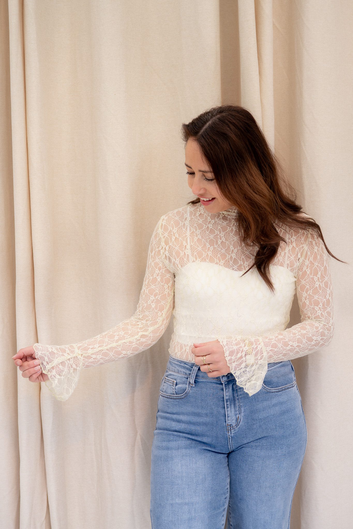 De stof is licht doorschijnend en sluit mooi aan op het lichaam. De uitlopende mouwen zorgen voor een luchtig en trendy effect, waardoor je deze top zowel los draagt als perfect combineert onder een blazer of gilet.