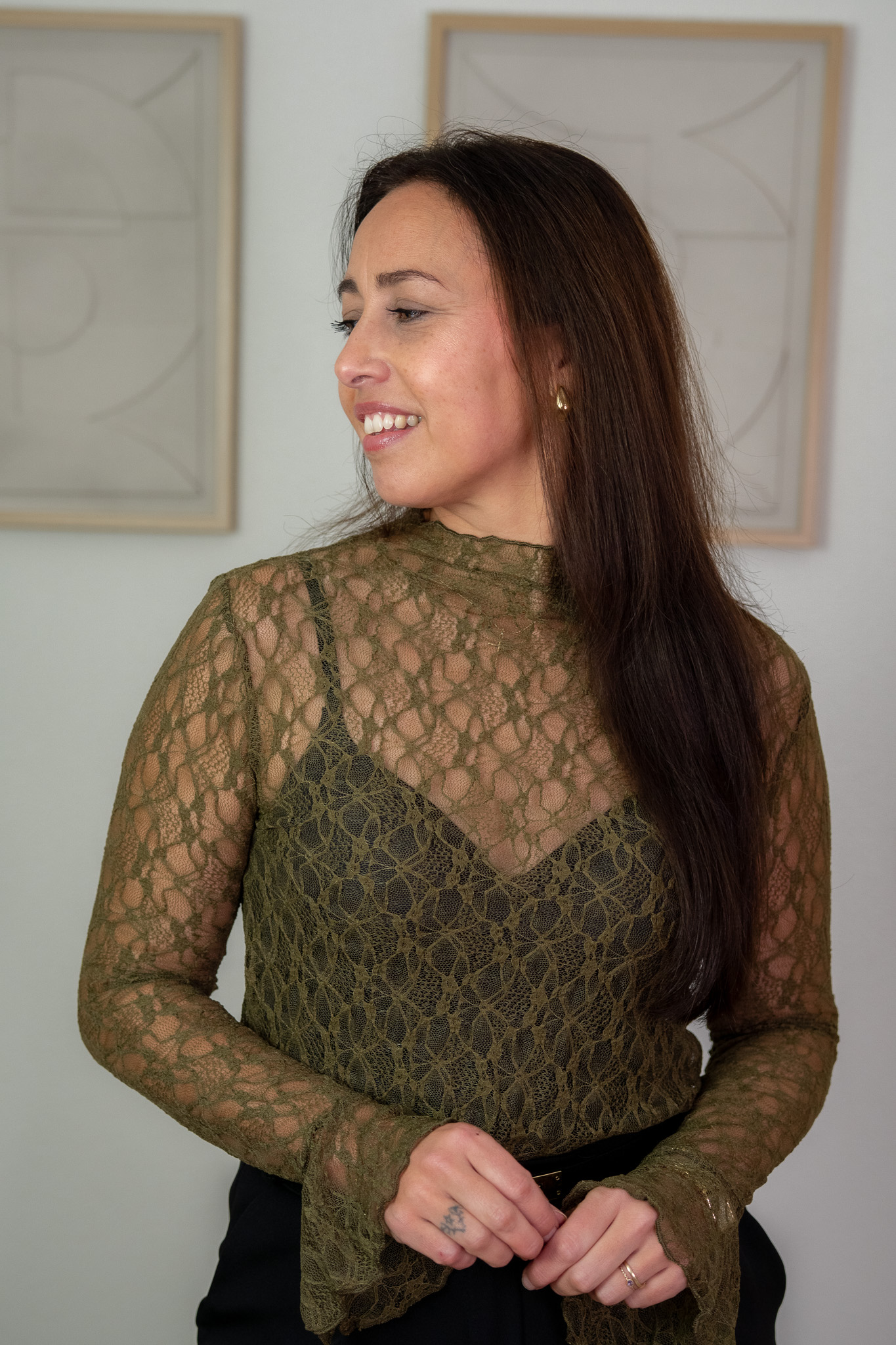 Een elegante, verfijnde kanten top in een zachte olijfgroene tint. De top is licht doorzichtig en heeft aan het uiteinde van de mouwen een speelse vlinderstrook, die zorgt voor een luchtige en vrouwelijke uitstraling. De rijke kleur en fijne kant geven dit item een chique, romantische look – perfect voor een feestelijke gelegenheid of als stijlvolle layering piece onder een blazer of gilet.