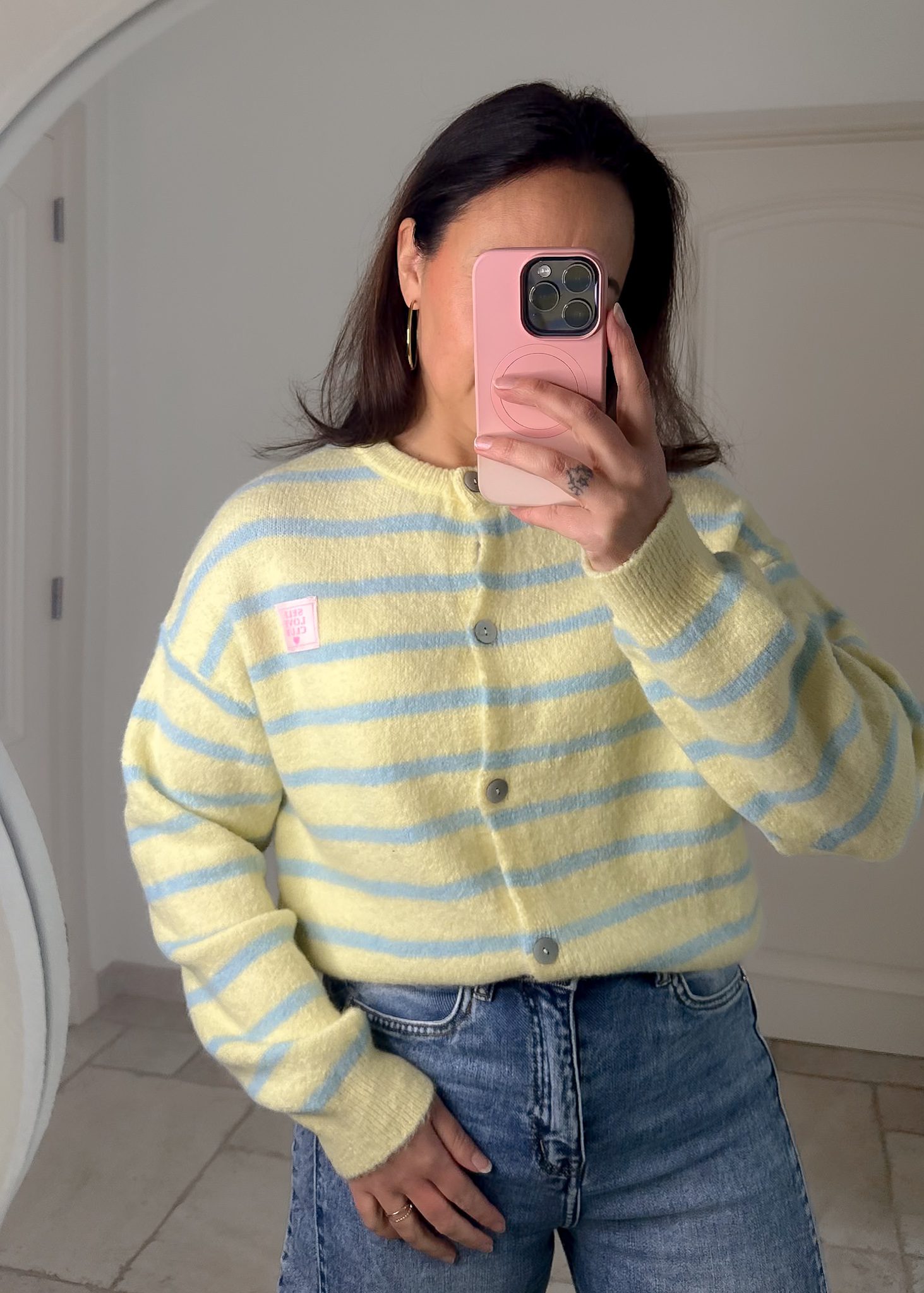 Perfect voor elke dag. De subtiele strepen geven het vest een rustige uitstraling, terwijl de knoopjes en ronde hals zorgen voor een vrouwelijke touch. Op het label staat selflove club in roze.