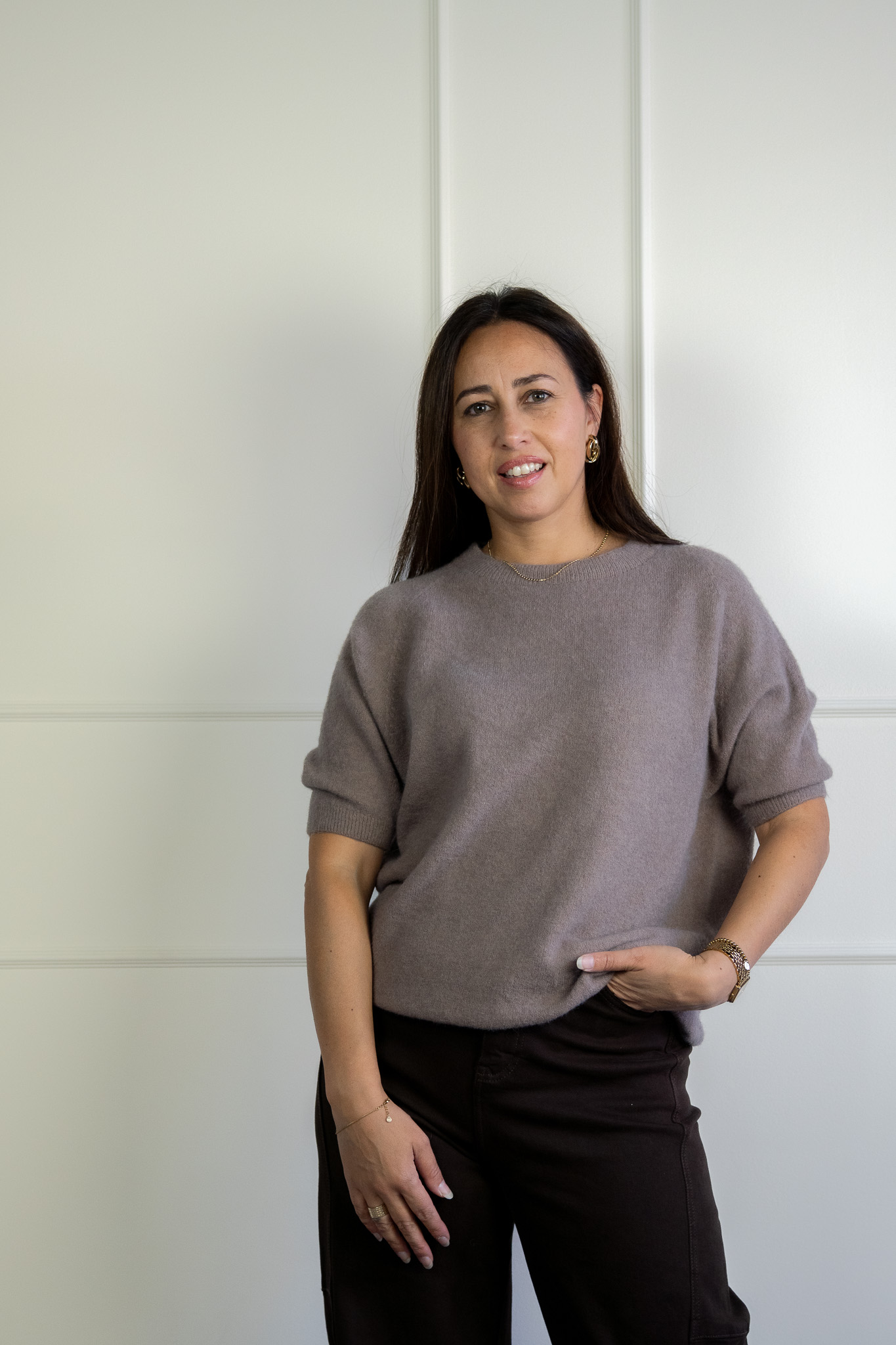 Ella T-shirt Taupe is een wollen t-shirt in een Taupe kleur. Het t-shirt heeft een ronde hals en heeft een heerlijk rekbaar stofje.