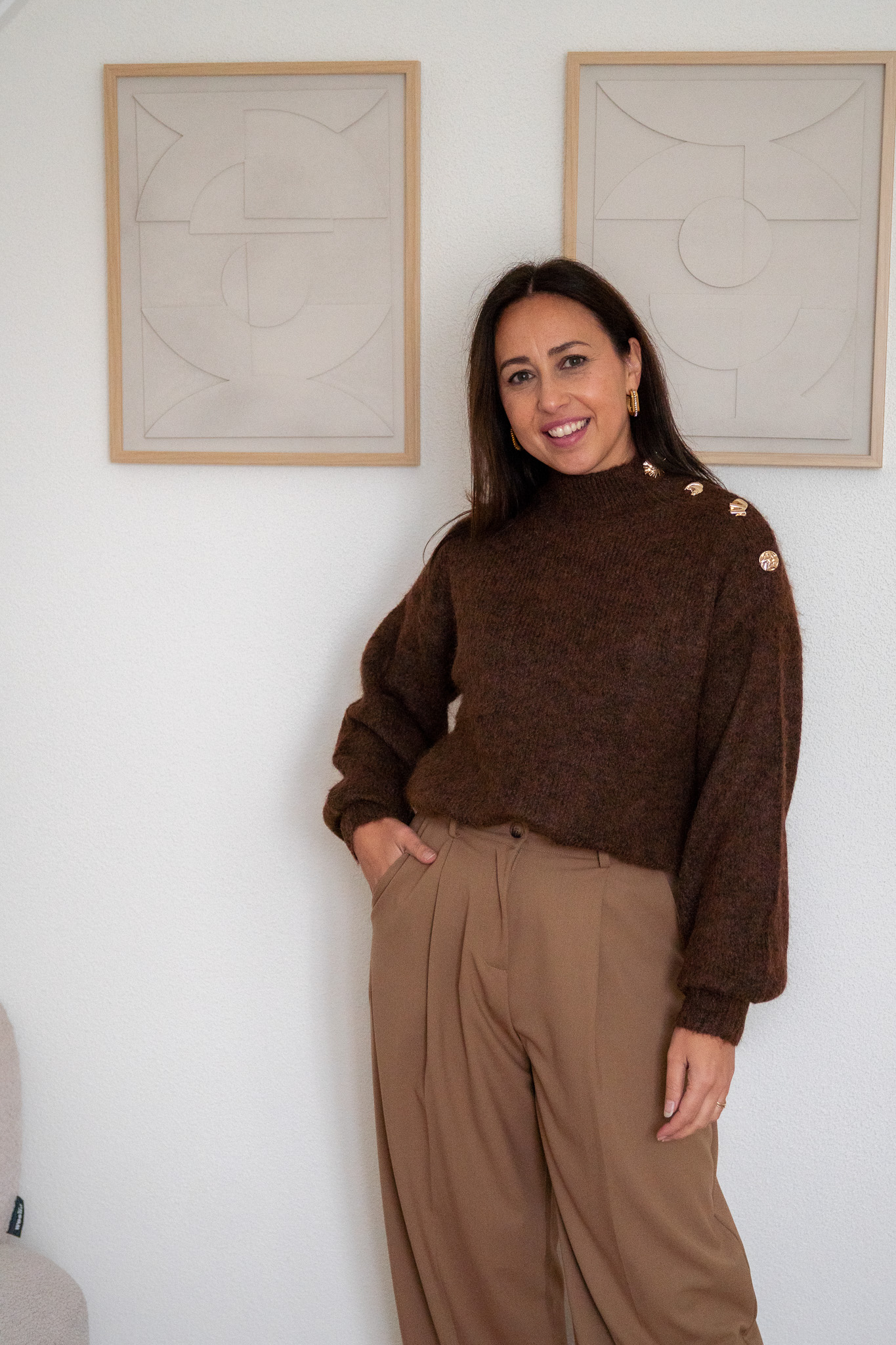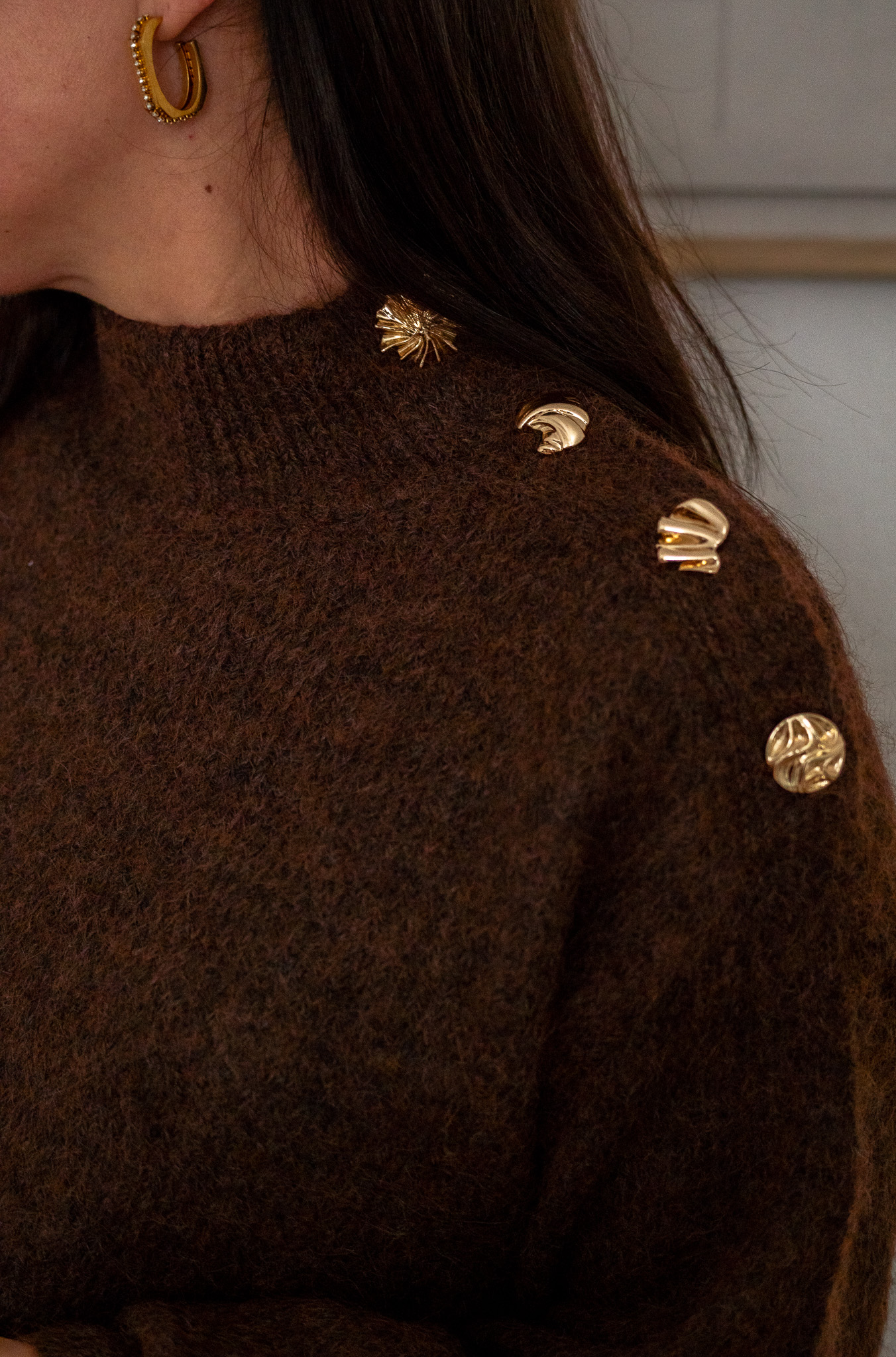 De Fenna trui is een stijlvolle wijdvallende trui met een vleugje luxe. Uitgevoerd in een warme bruine tint en afgewerkt met subtiele gouden knopen aan de zijkant van de hals, die zorgen voor een verfijnde, vrouwelijke touch.