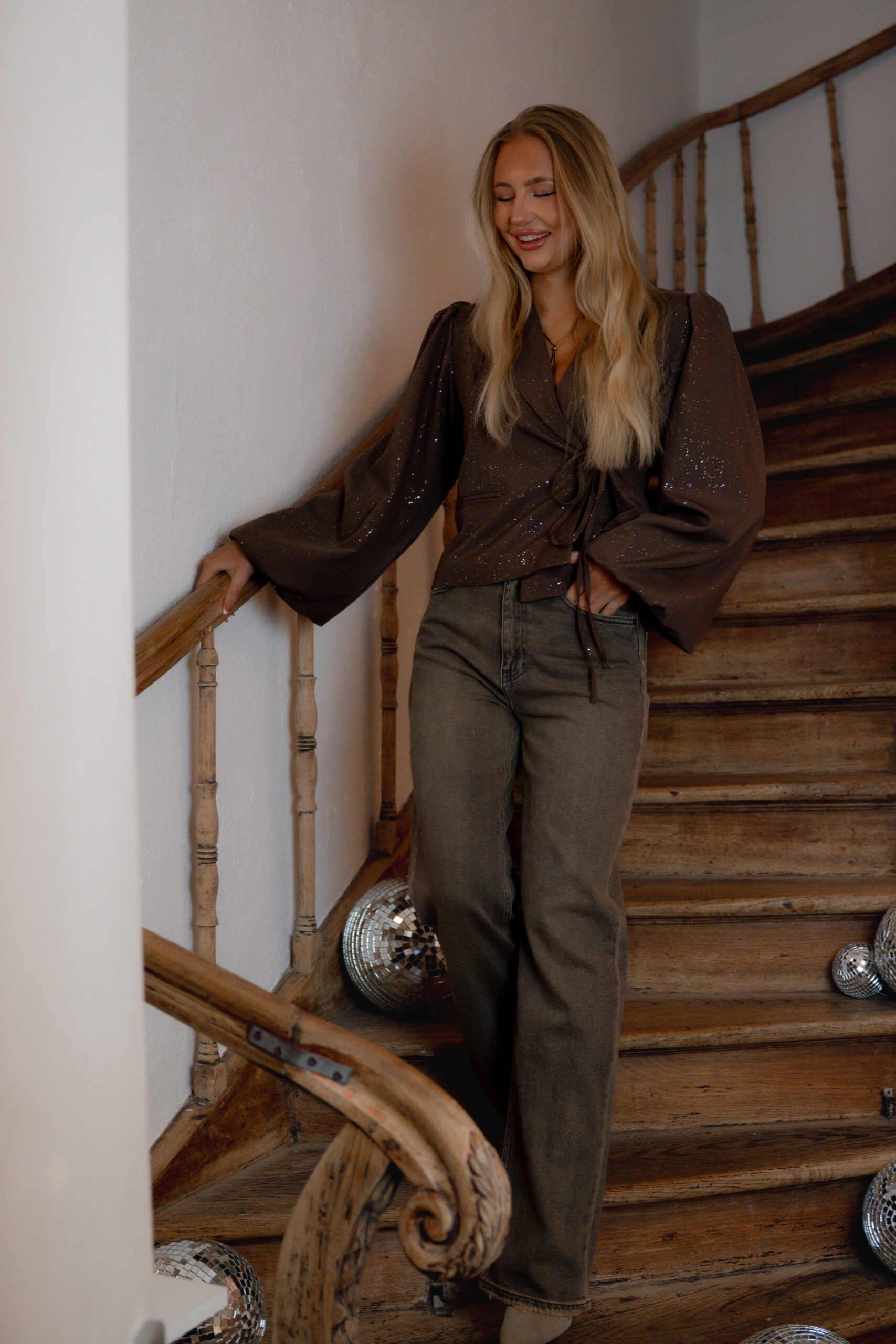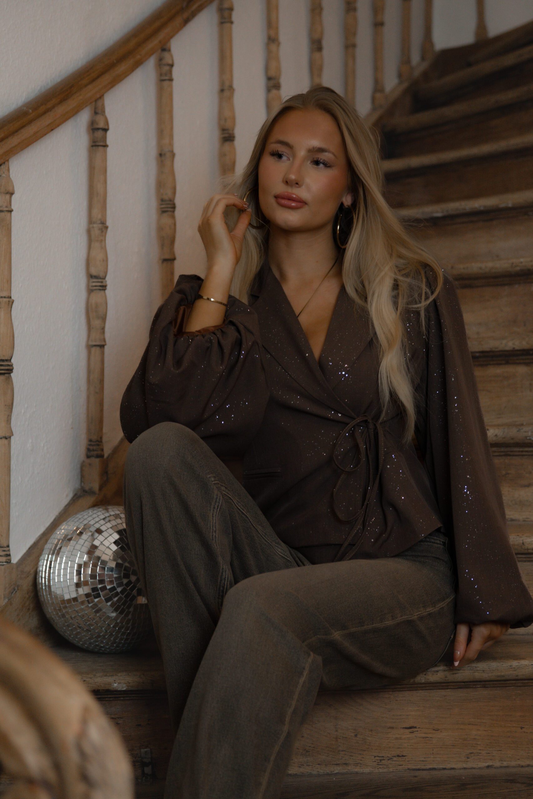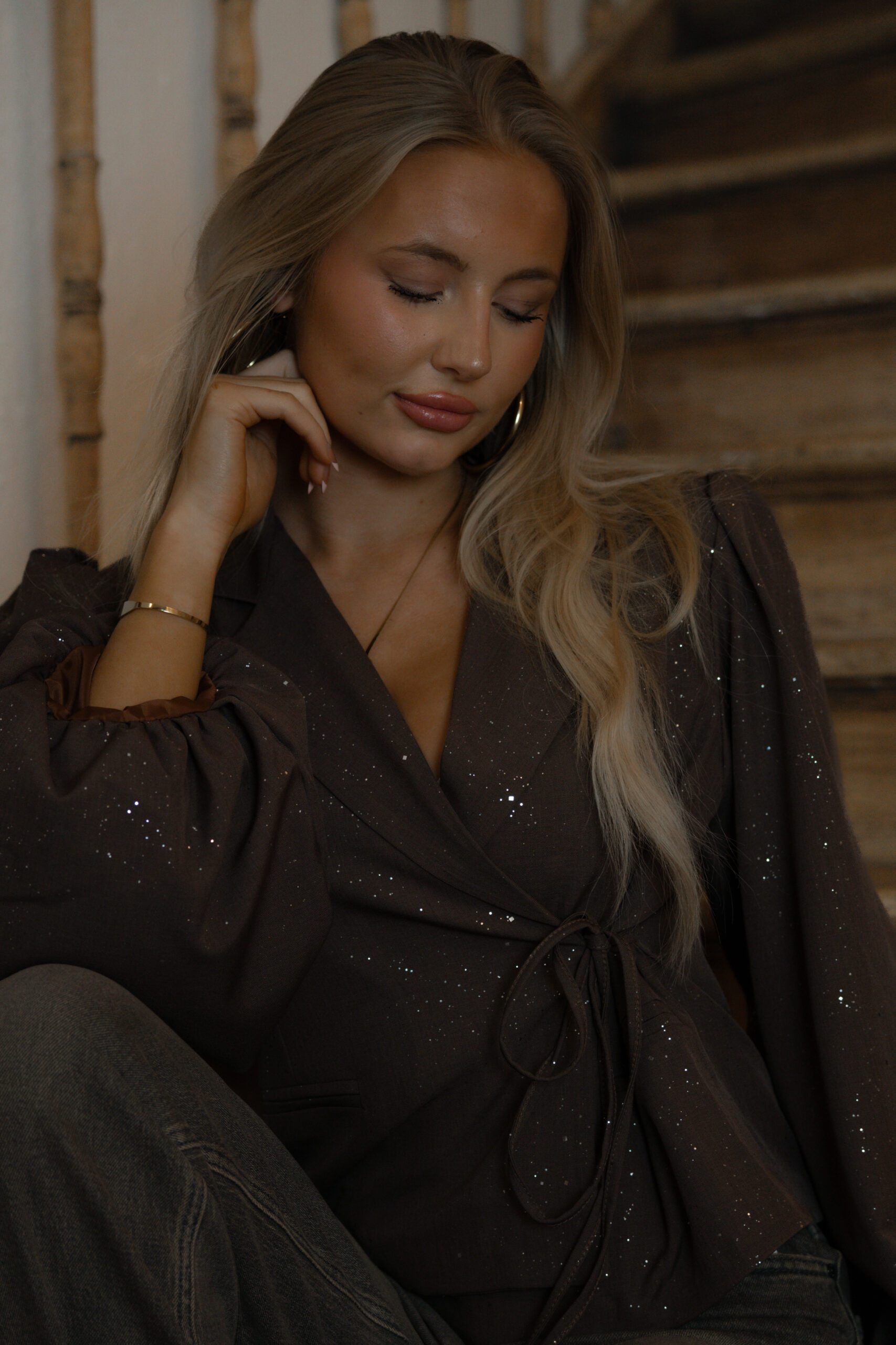 De Florine Blazer in bruin heeft een korte, elegante uitstraling met subtiele glitterdetails die de blazer een chique, feestelijke touch geven. De pofmouw en gevormde schouders zorgen voor een krachtige, vrouwelijke look die zowel modern als stijlvol is. De overslagsluiting met koord maakt het jasje speels en mooi aansluitend, terwijl de lengte van 48 cm het model ideaal maakt voor zowel kantoor als party outfits.
