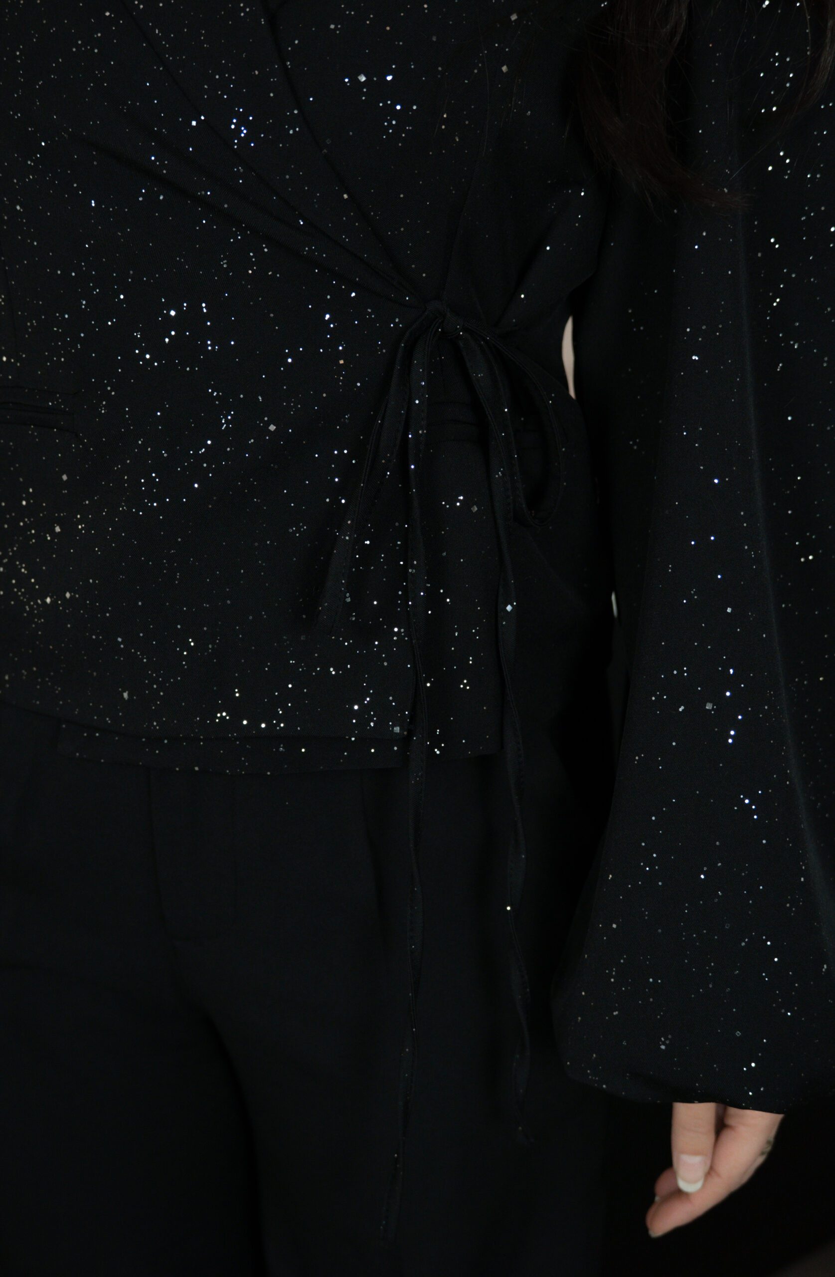 De zwarte Florine Blazer is een stijlvolle, korte blazer met glitterdetails die perfect past bij feestelijke en chique gelegenheden. De pofmouw en gevormde schouders geven de blazer een krachtige, moderne look, terwijl de overslagsluiting met koord zorgt voor een mooi silhouet. De stof zit comfortabel en de lengte van 48 cm maakt het een ideaal item om te dragen op zowel broeken als rokken.