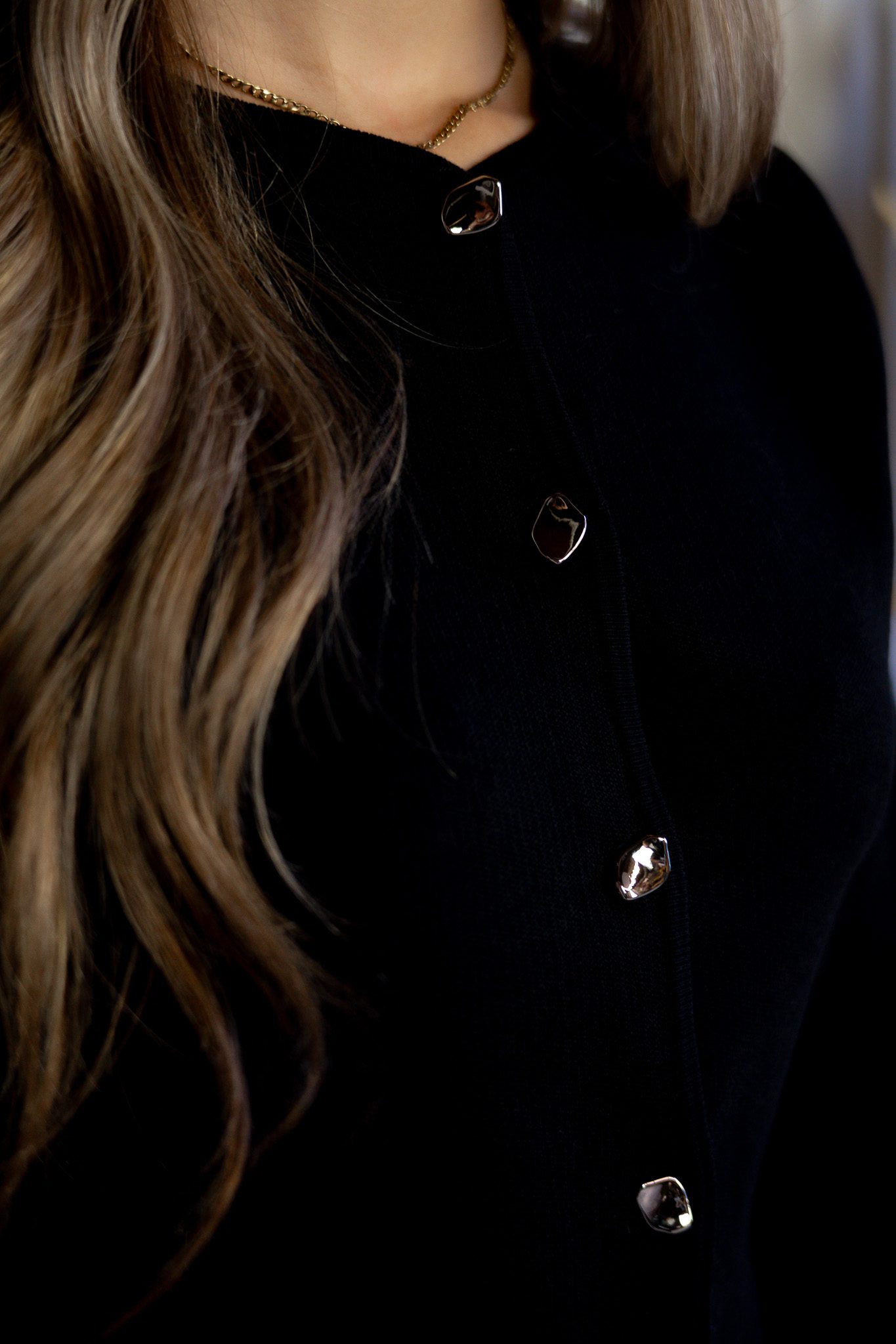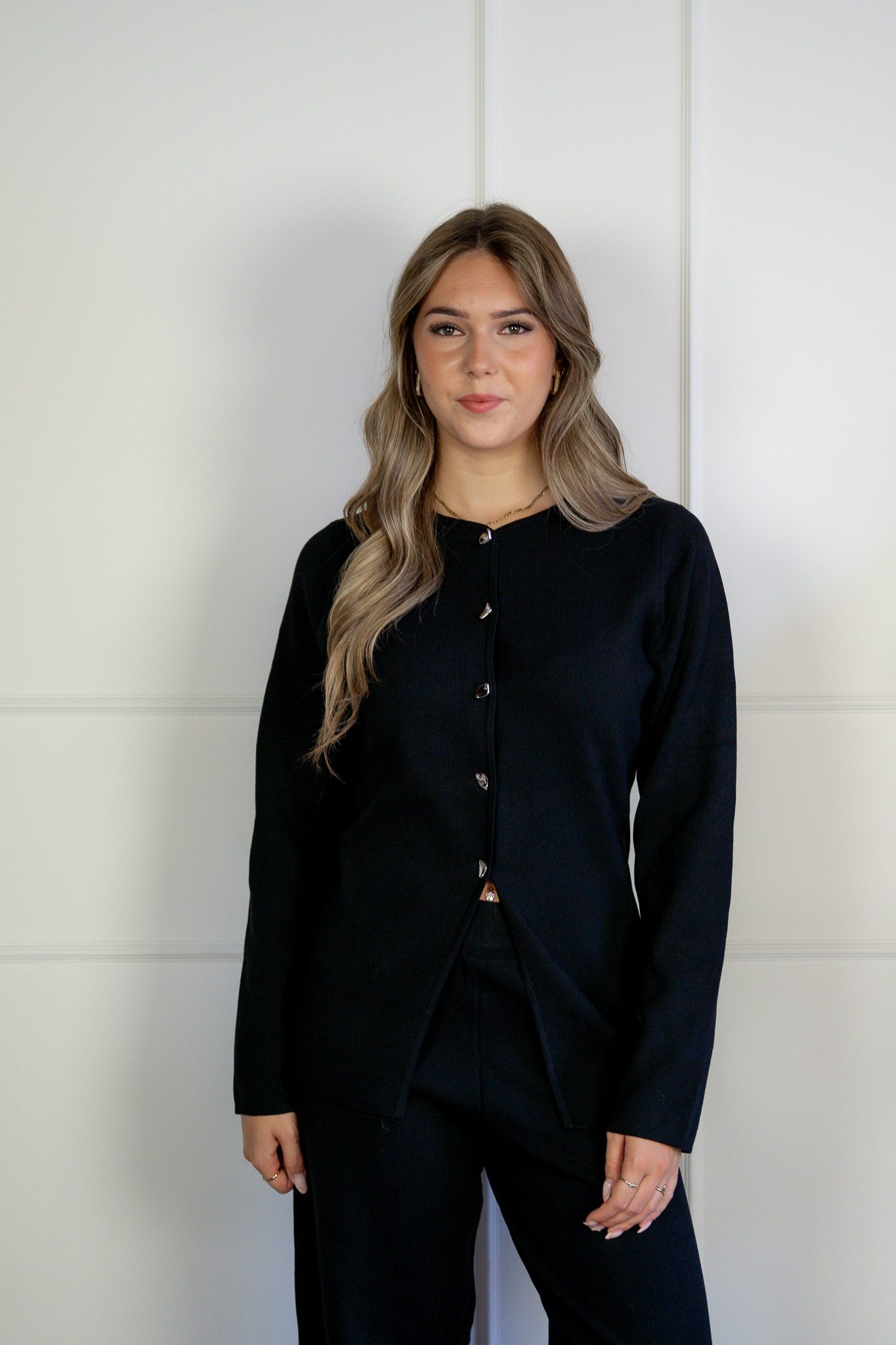 Jolina Vest Zwart van sheclothes is een mooi vest met lange mouwen. Het vest heeft een ronde hals en mooie zilveren knopen om het vestje dicht te dragen. Het vest loopt aan de onderkant uit wat een getailleerd effect geeft.