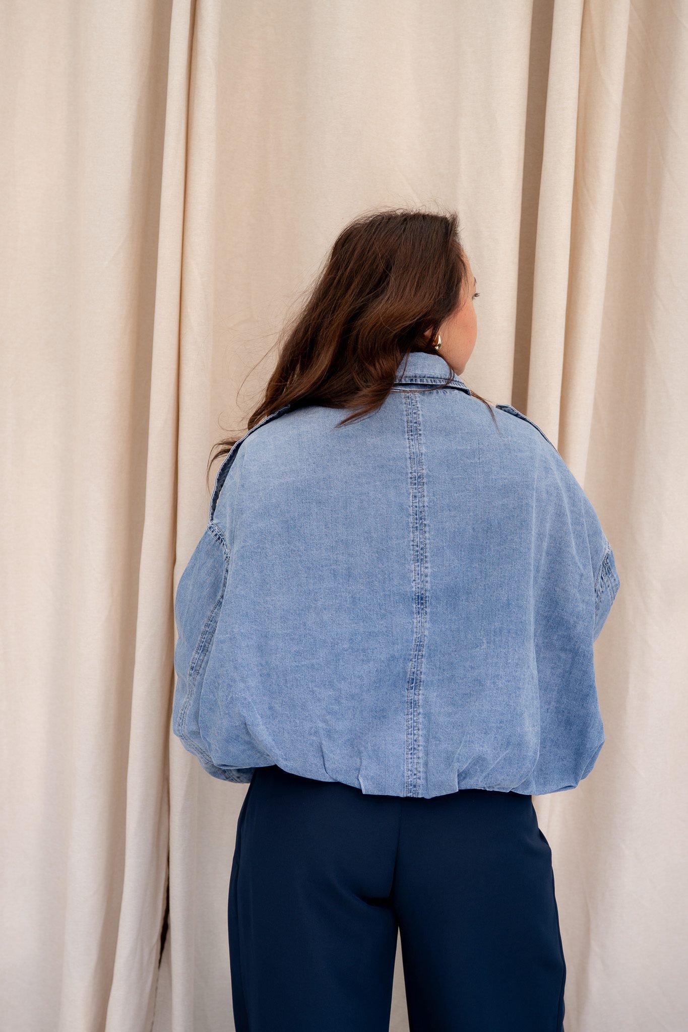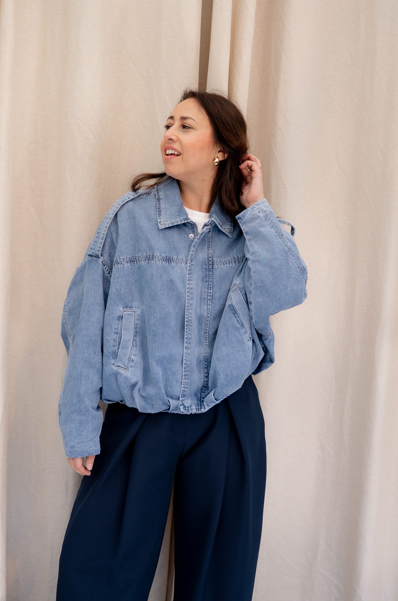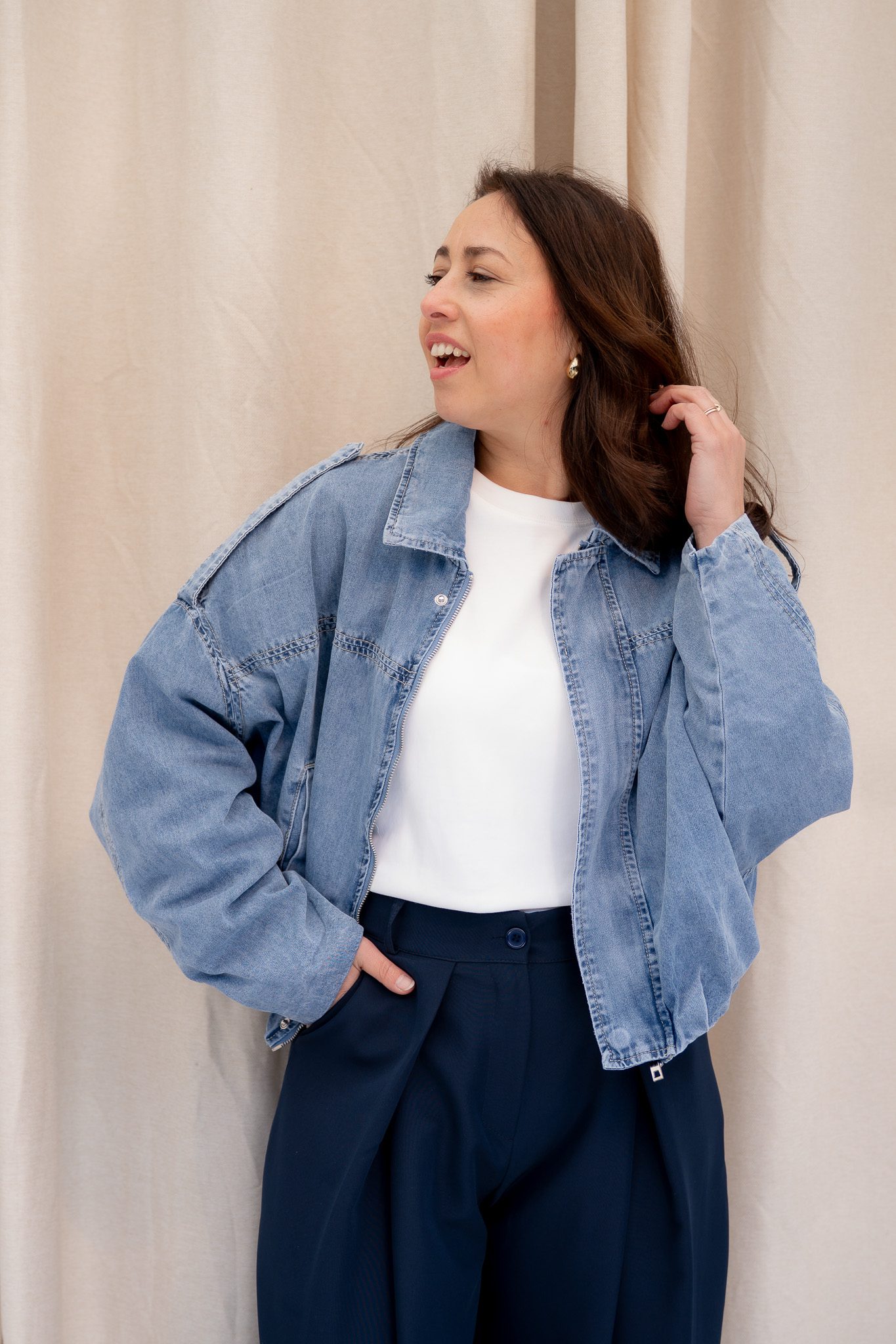 De denim bomberjas is een stoer en tegelijkertijd vrouwelijk item met een moderne uitstraling. De licht cropped lengte in combinatie met de ruimvallende fit zorgt voor een effortless look die je outfit direct een upgrade geeft.