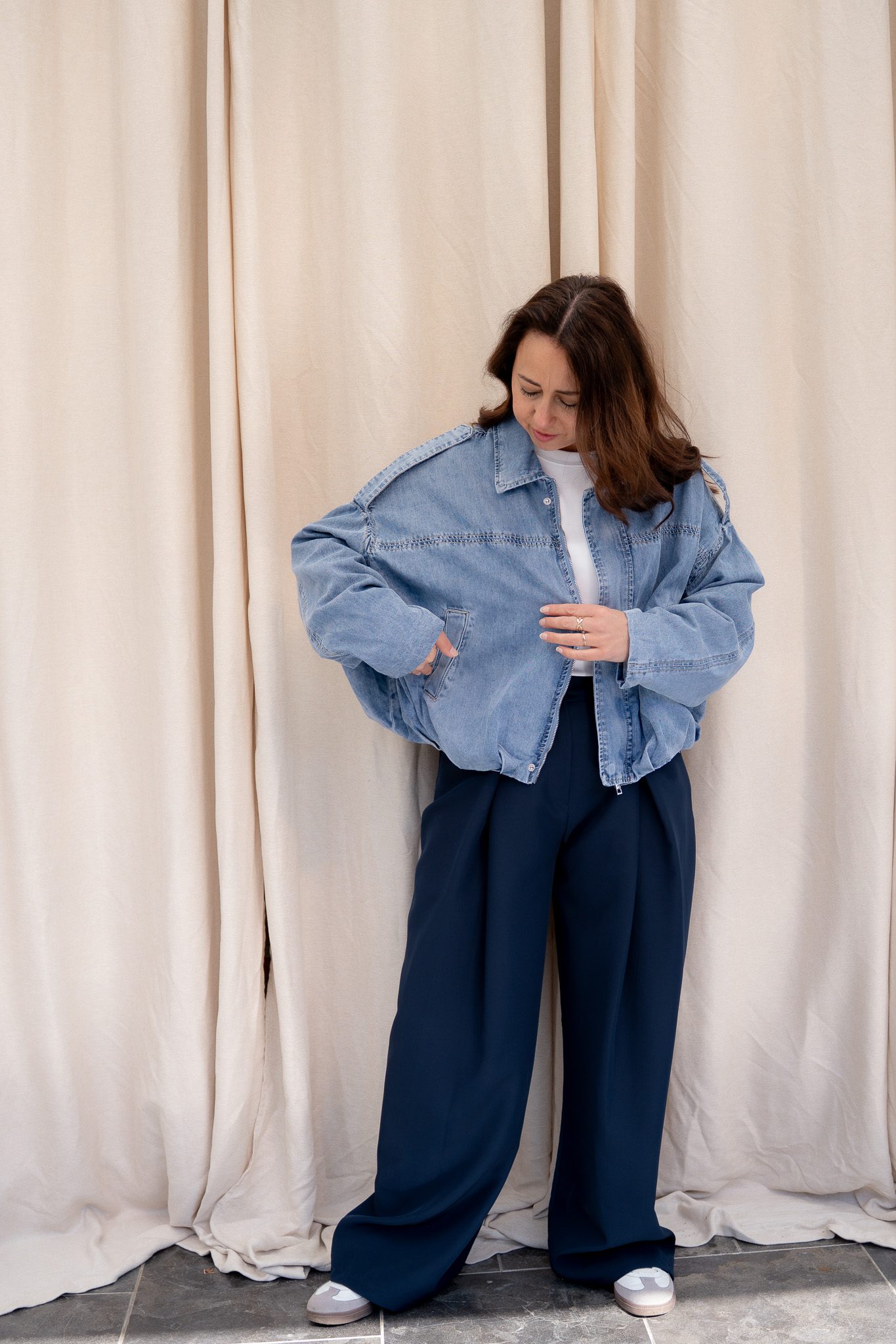 De soepele denimstof valt losjes om het lichaam en draagt comfortabel, terwijl de verborgen ritssluiting aan de voorzijde zorgt voor een rustige, minimalistische afwerking. Hierdoor is de jas makkelijk te combineren en geschikt voor zowel casual als meer geklede outfits.