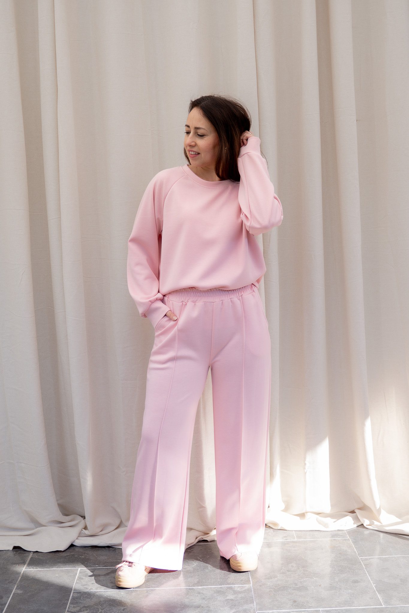 De sweater heeft een comfortabele, licht oversized pasvorm en valt mooi losjes om het lichaam. De broek heeft een elastische tailleband en een soepel vallende, wijde pijp, wat zorgt voor een flatterend silhouet én ultiem draagcomfort. Samen vormen ze een set die je moeiteloos draagt thuis, onderweg of casual chic gecombineerd met sneakers.