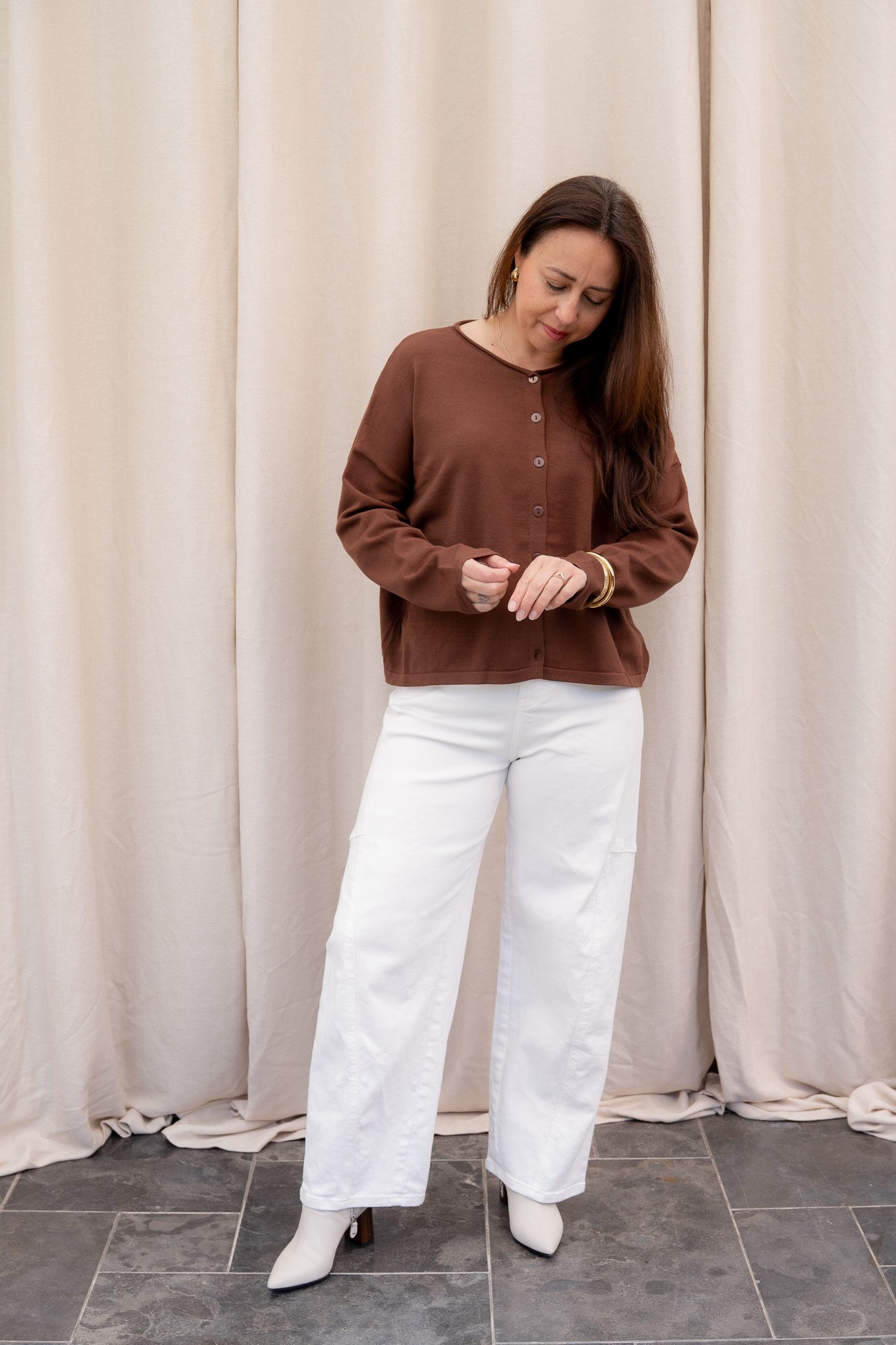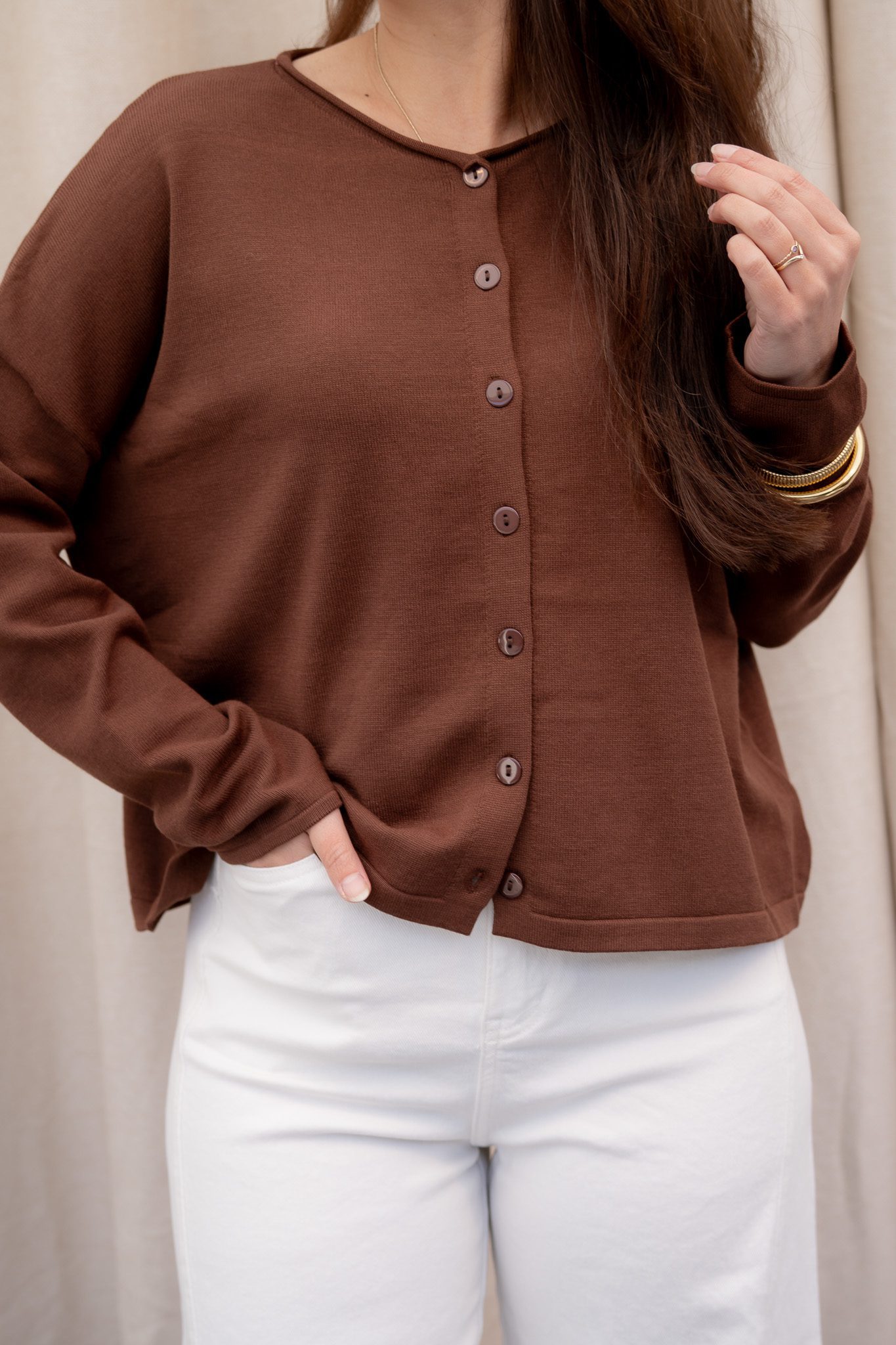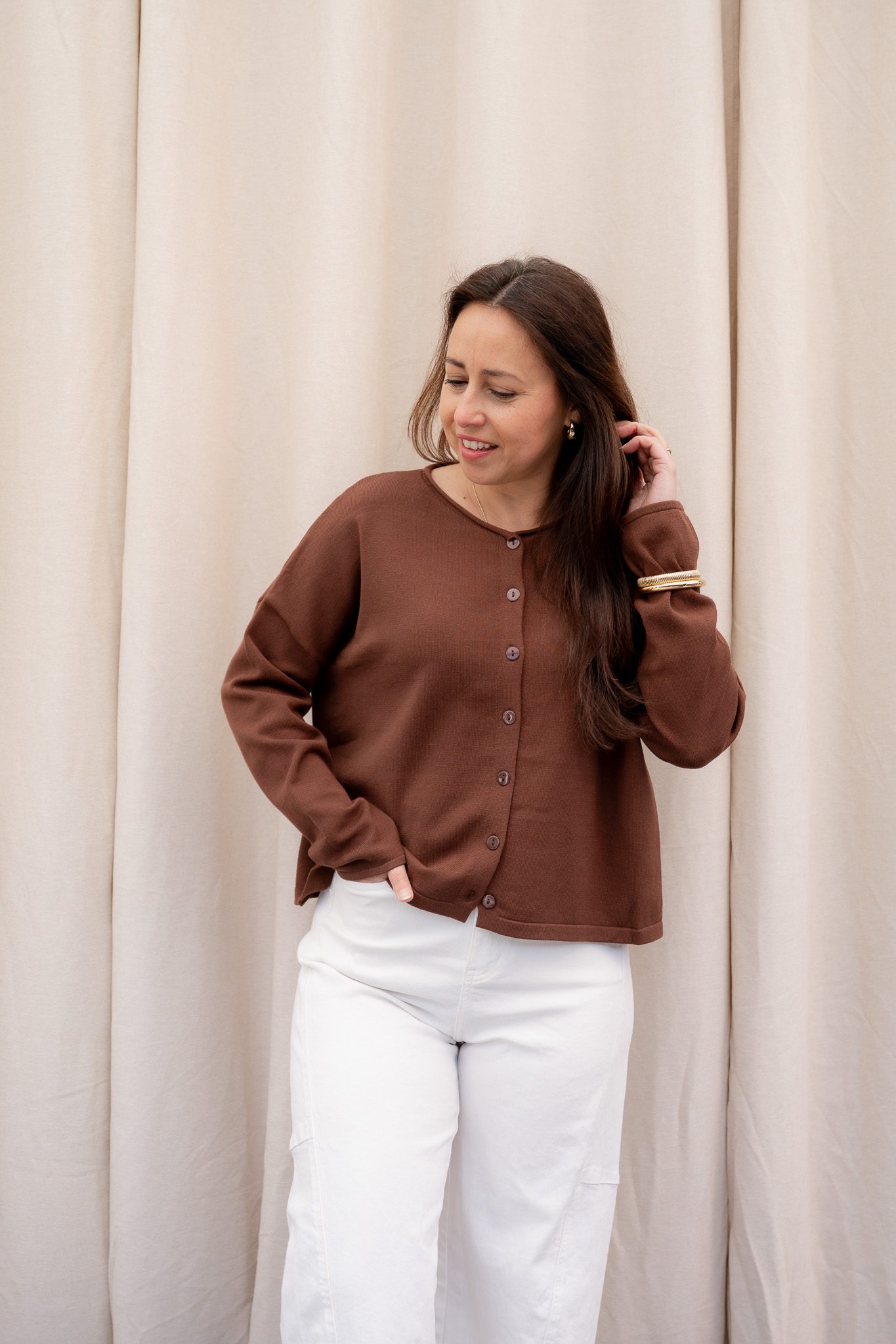 Het Lori vest heeft een soepelvallend model met lange mouwen en een licht cropped lengte. De knoopsluiting aan de voorkant geeft het vest een klassieke en vrouwelijke uitstraling, terwijl de stof mooi langs het lichaam valt.