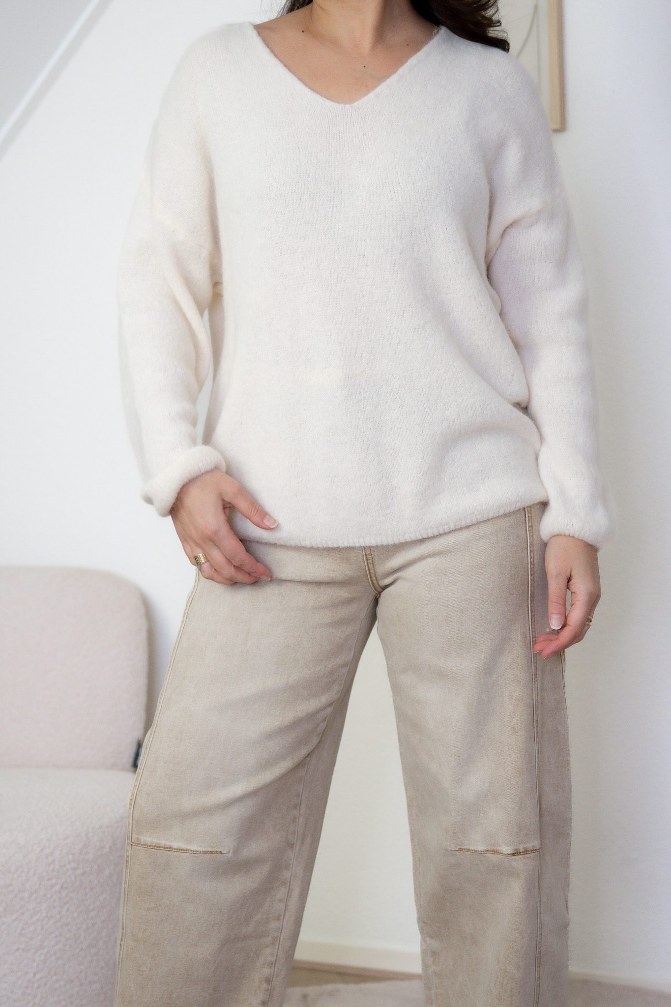 De Merle Trui in Wolwit is een zachte fijngebreide trui met een V-hals. De trui voelt comfortabel aan en heeft een wijdere fit voor een ontspannen look. Ideale trui voor richting het voorjaar. Combineer nde Merle trui met een mooie pantalon of jeans.