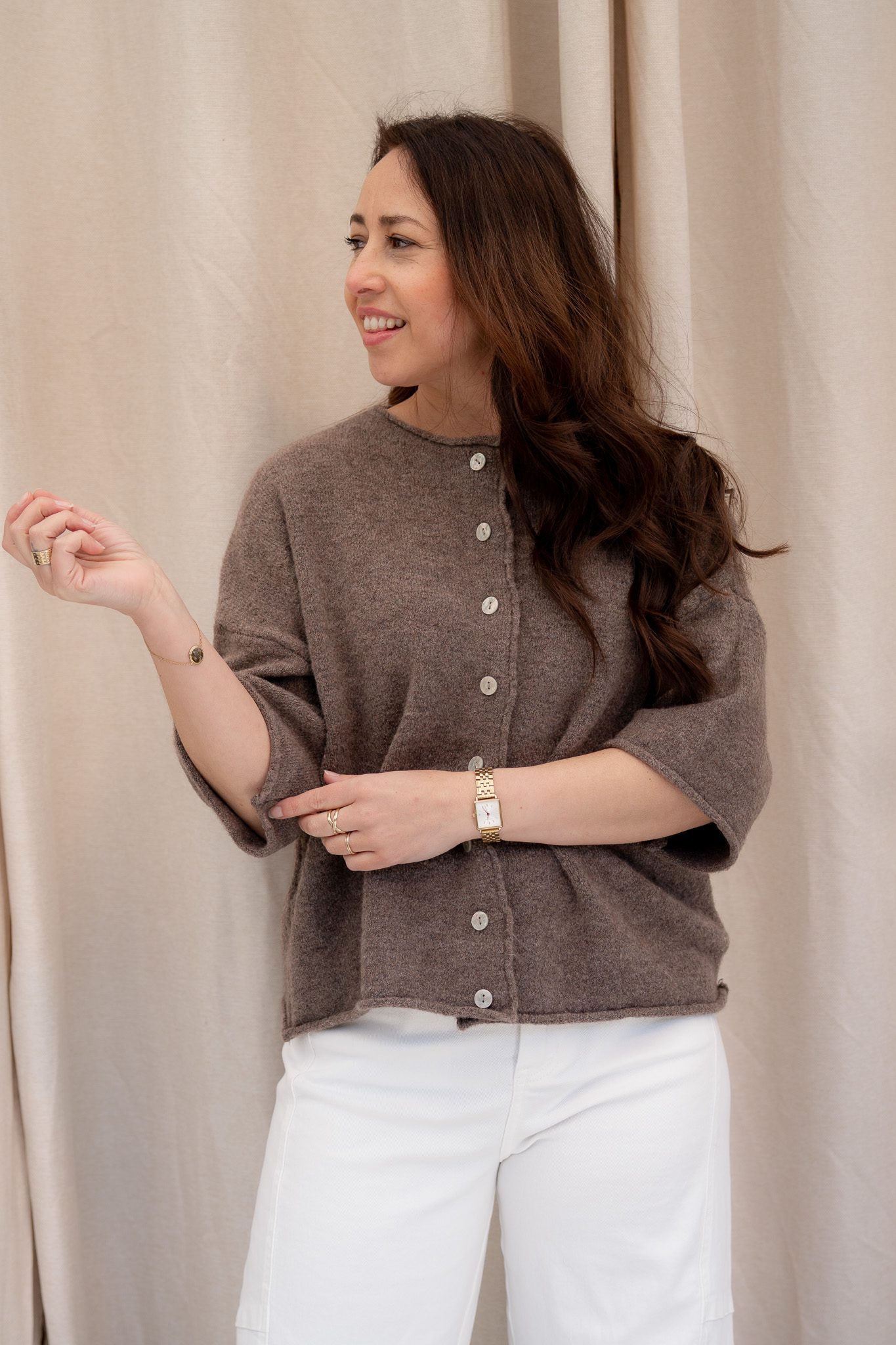 De knit voelt heerlijk zacht aan en kriebelt niet, waardoor je het vestje comfortabel direct op de huid draagt. De ronde hals, korte mouwen en fijne knoopjes zorgen voor een vrouwelijke en verfijnde look met een moderne twist.