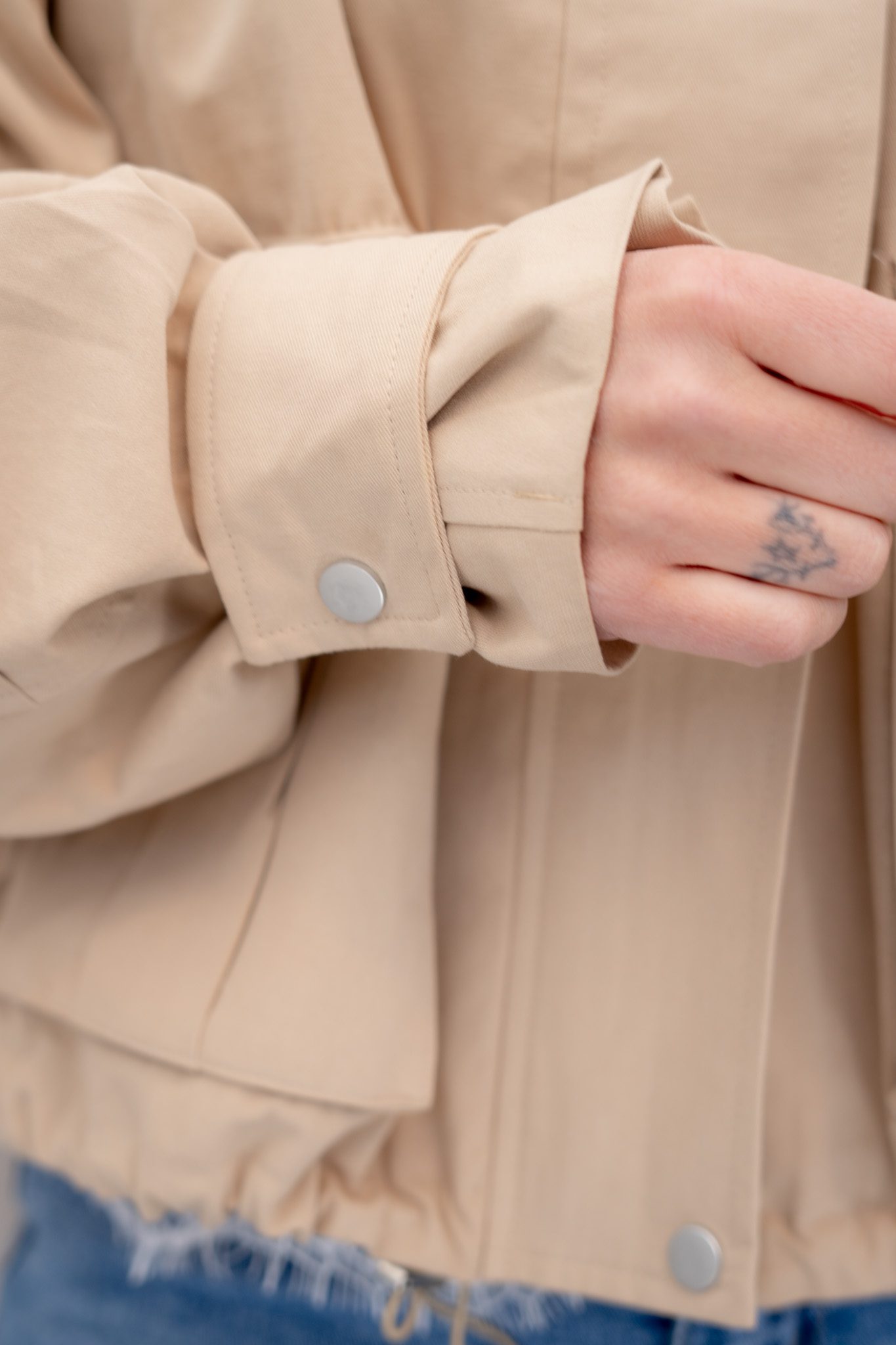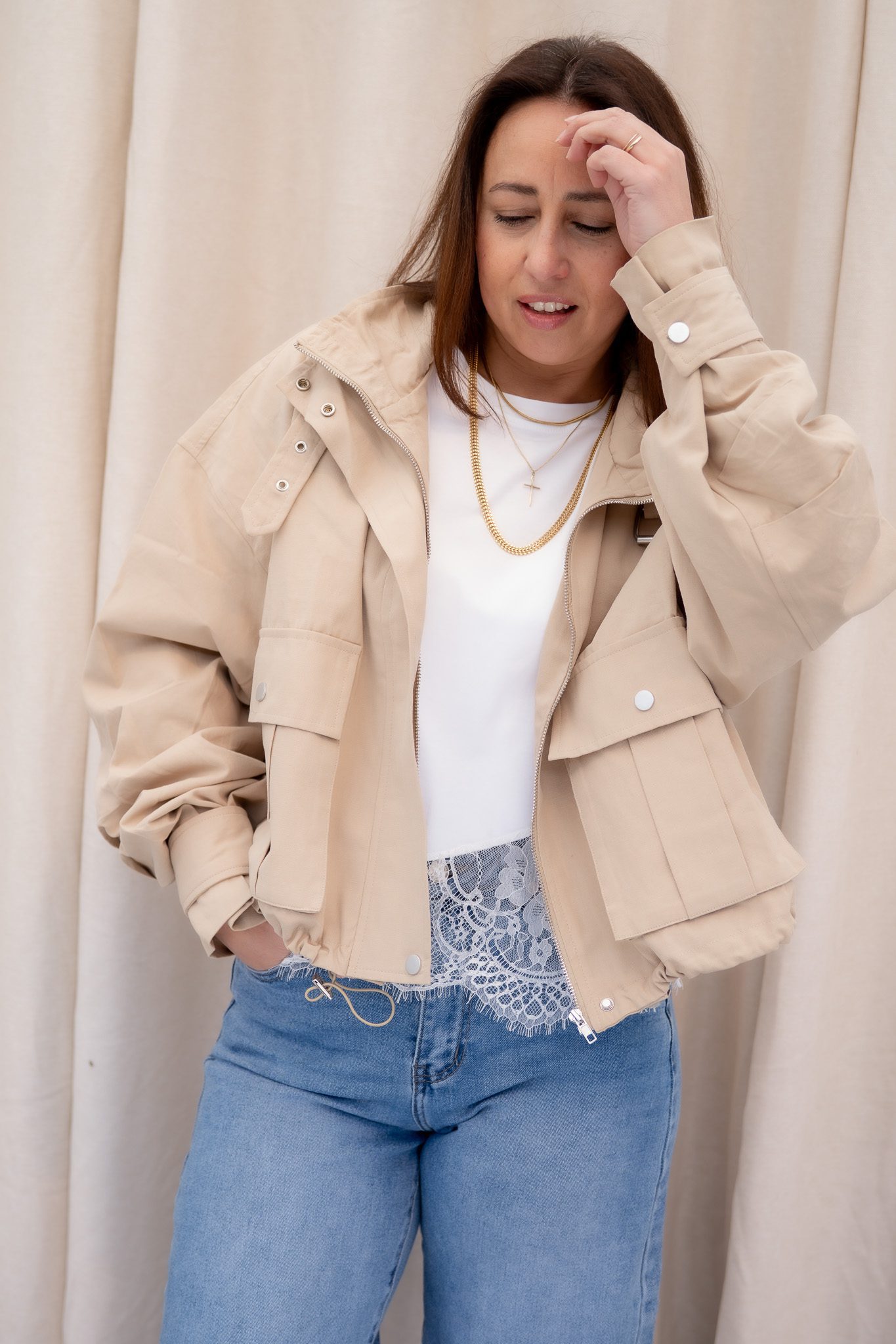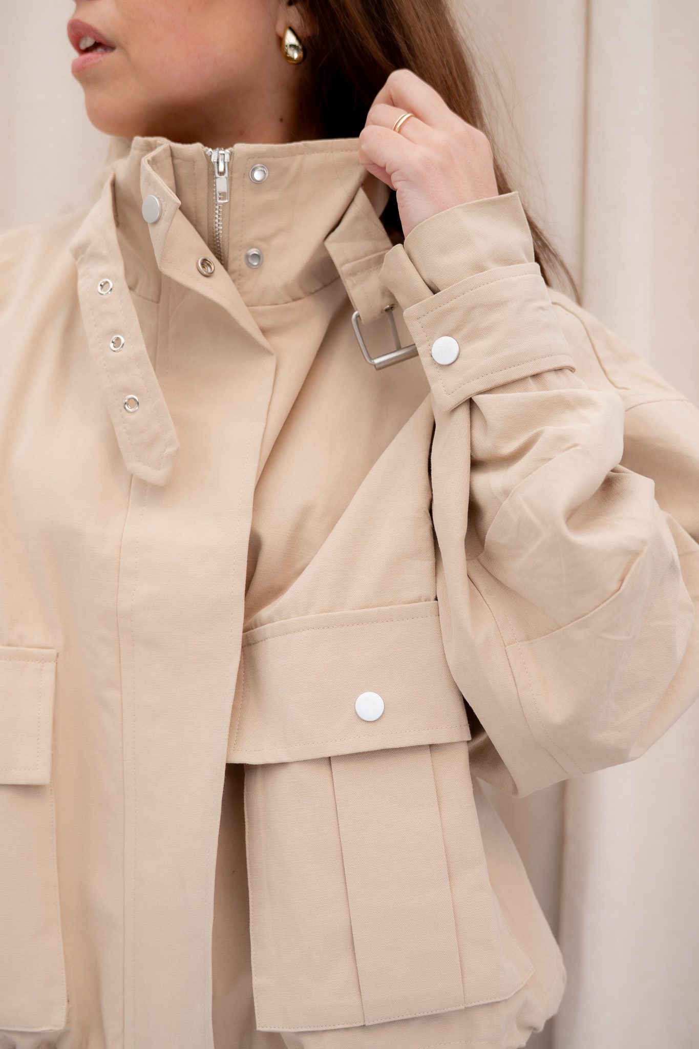 De grote zakken en de rits met drukknopen geven ‘m die effortless, stoere vibe terwijl de beige kleur juist zorgt dat je het makkelijk combineren.