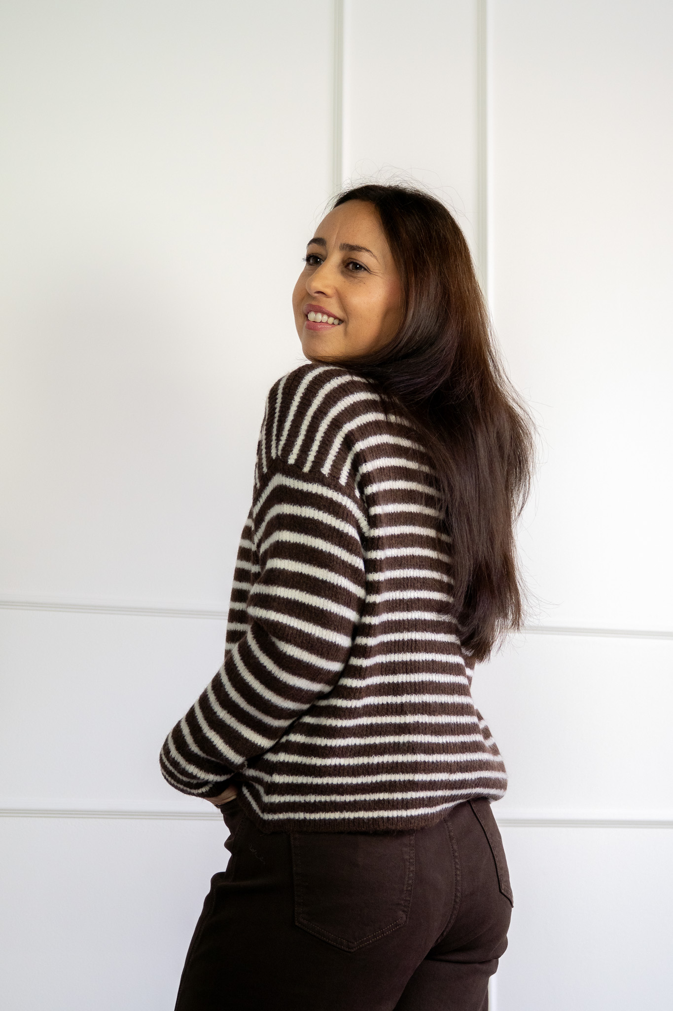 Missy Vest Bruin Gestreept van sheclothes is een mooi bruin vest met witte strepen en lange mouwen. Het vest heeft een ronde hals en mooie knopen om het vestje dicht te dragen. Het vest is losvallend.