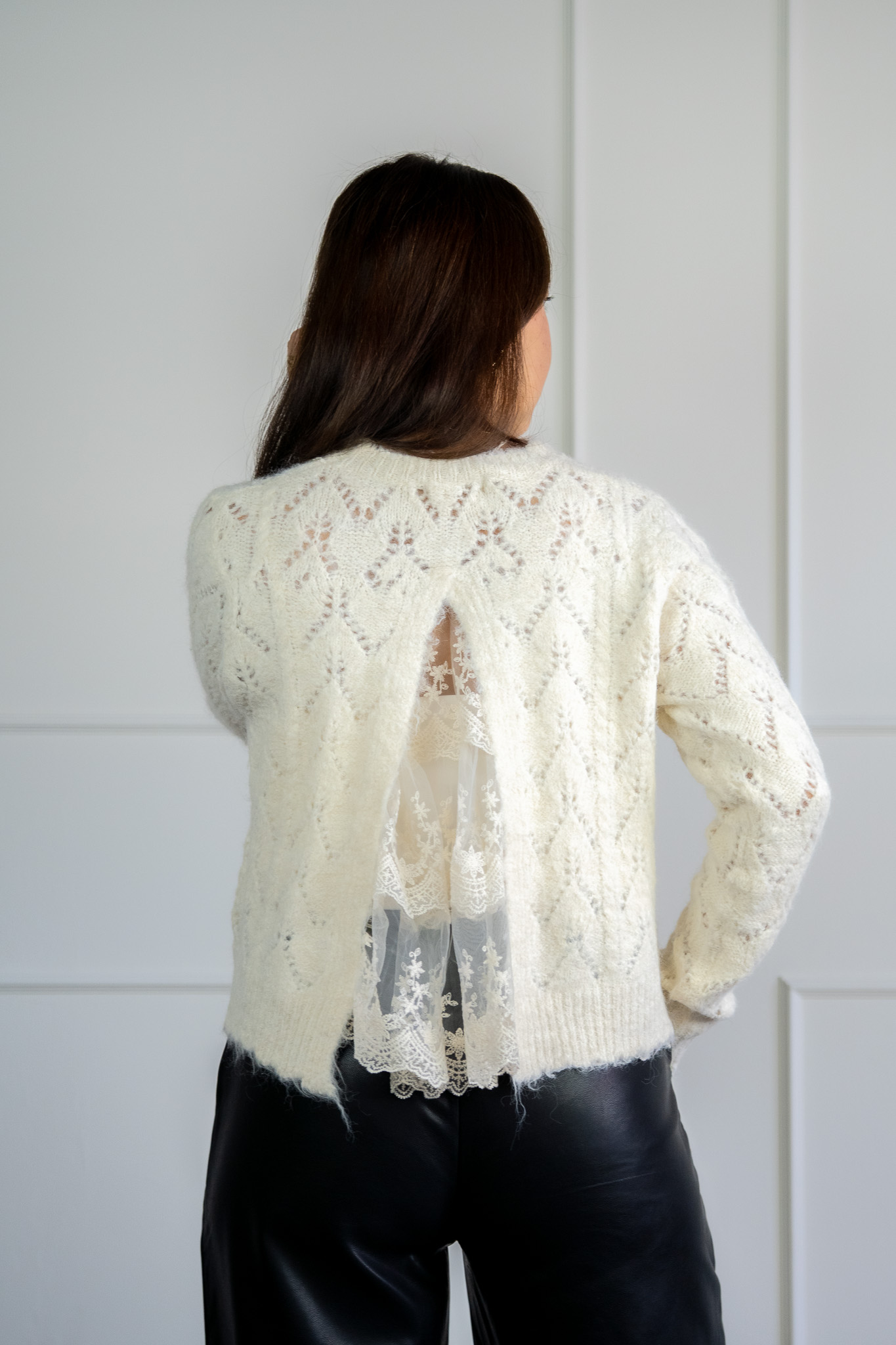 Musy Trui Creme van she clothes is een gebreide trui in de kleur Creme. De trui heeft een losvallend model. De trui heeft een unieke achterzijde omdat het een open rug heeft met een kanten detail.