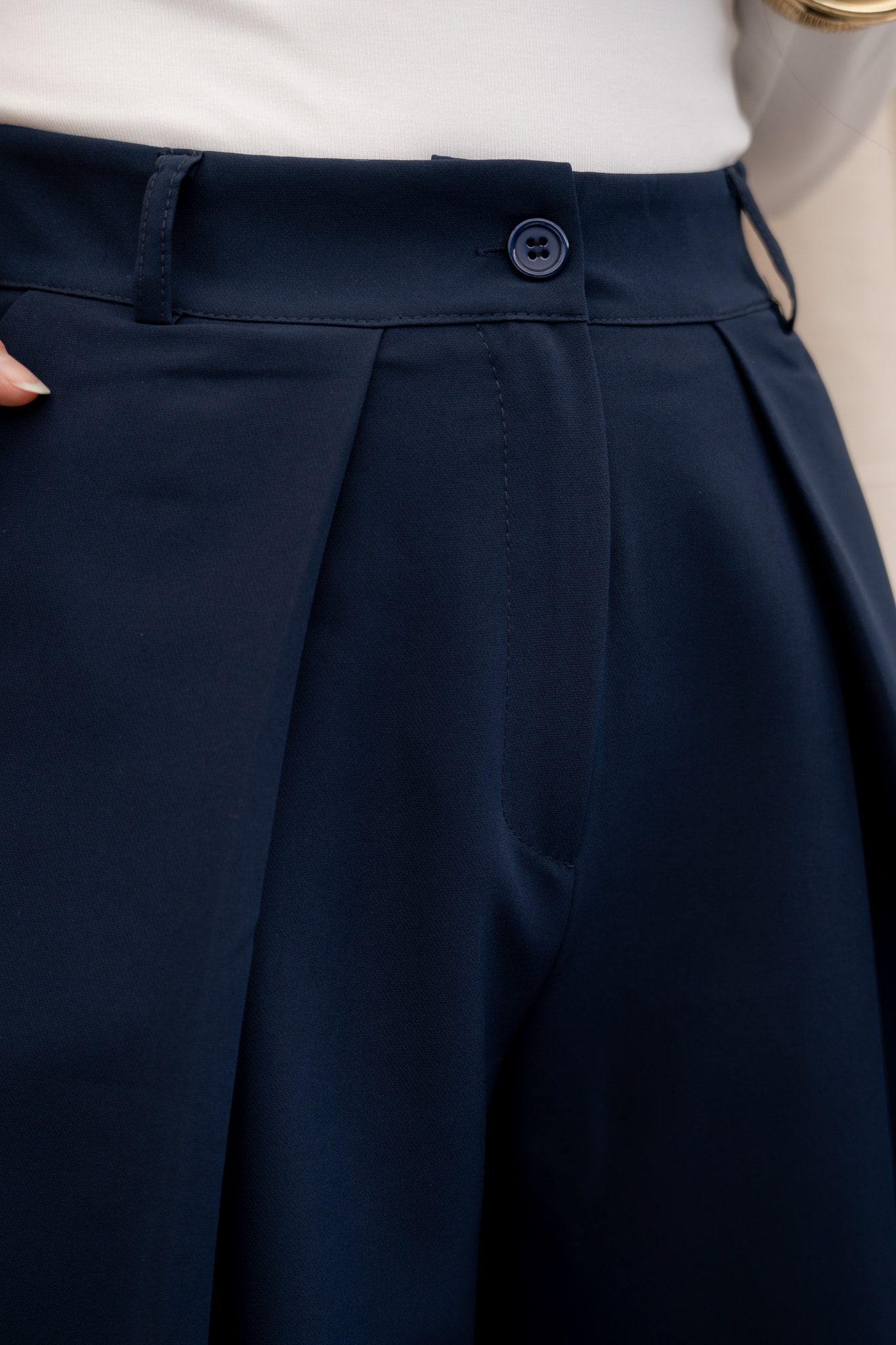 De Nara pantalon is een elegante, wijdvallende broek met een tijdloze en verfijnde uitstraling. De vaste plooien aan de voorzijde zorgen voor een klassieke, stijlvolle look, terwijl de elastische band aan de achterzijde extra comfort biedt. De voorkant heeft een nette, gladde tailleband, waardoor de pantalon zowel chic als draagbaar blijft.