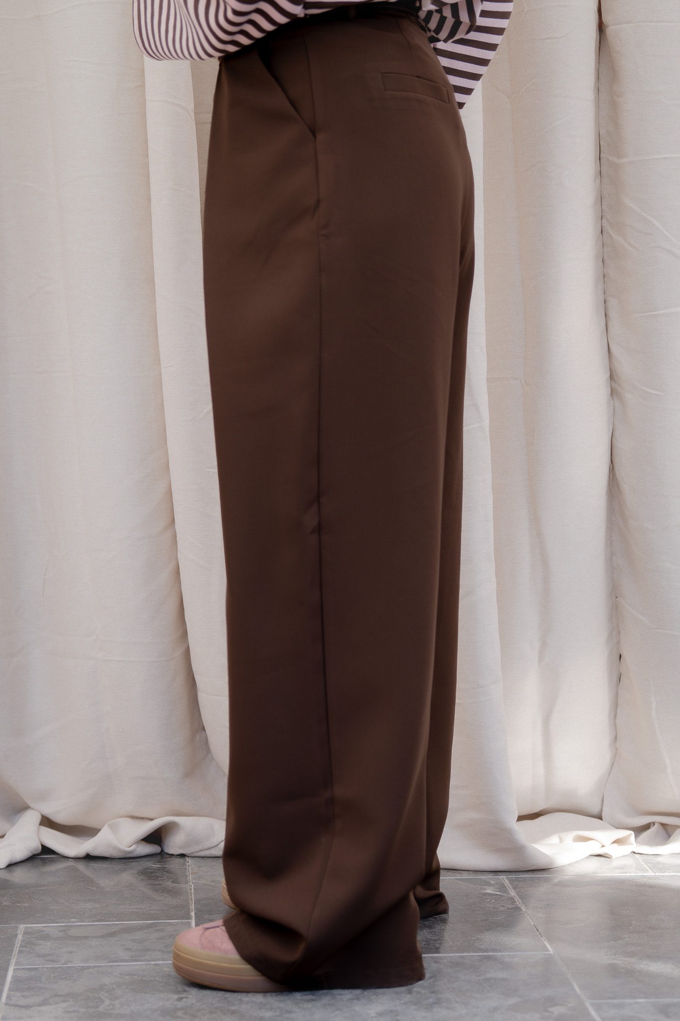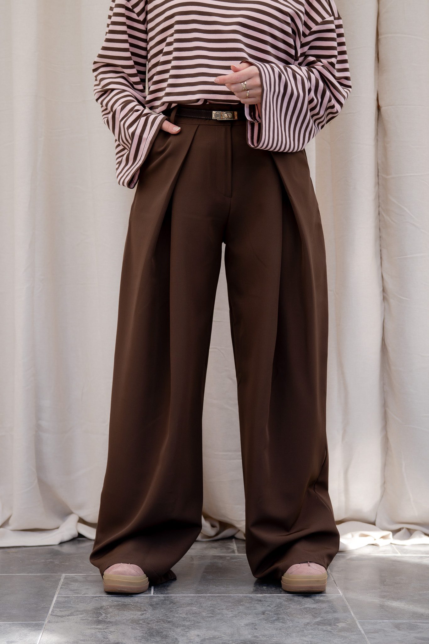De Nara pantalon is een elegante, wijdvallende broek met een tijdloze en verfijnde uitstraling. De vaste plooien aan de voorzijde zorgen voor een klassieke, stijlvolle look, terwijl de elastische band aan de achterzijde extra comfort biedt. De voorkant heeft een nette, gladde tailleband, waardoor de pantalon zowel chic als draagbaar blijft.