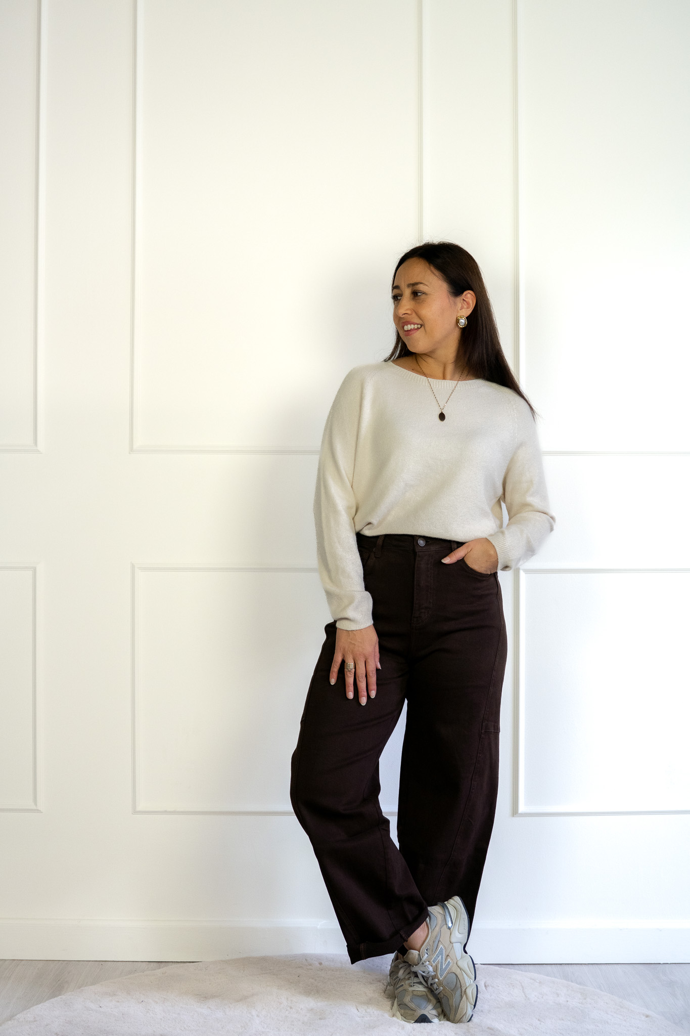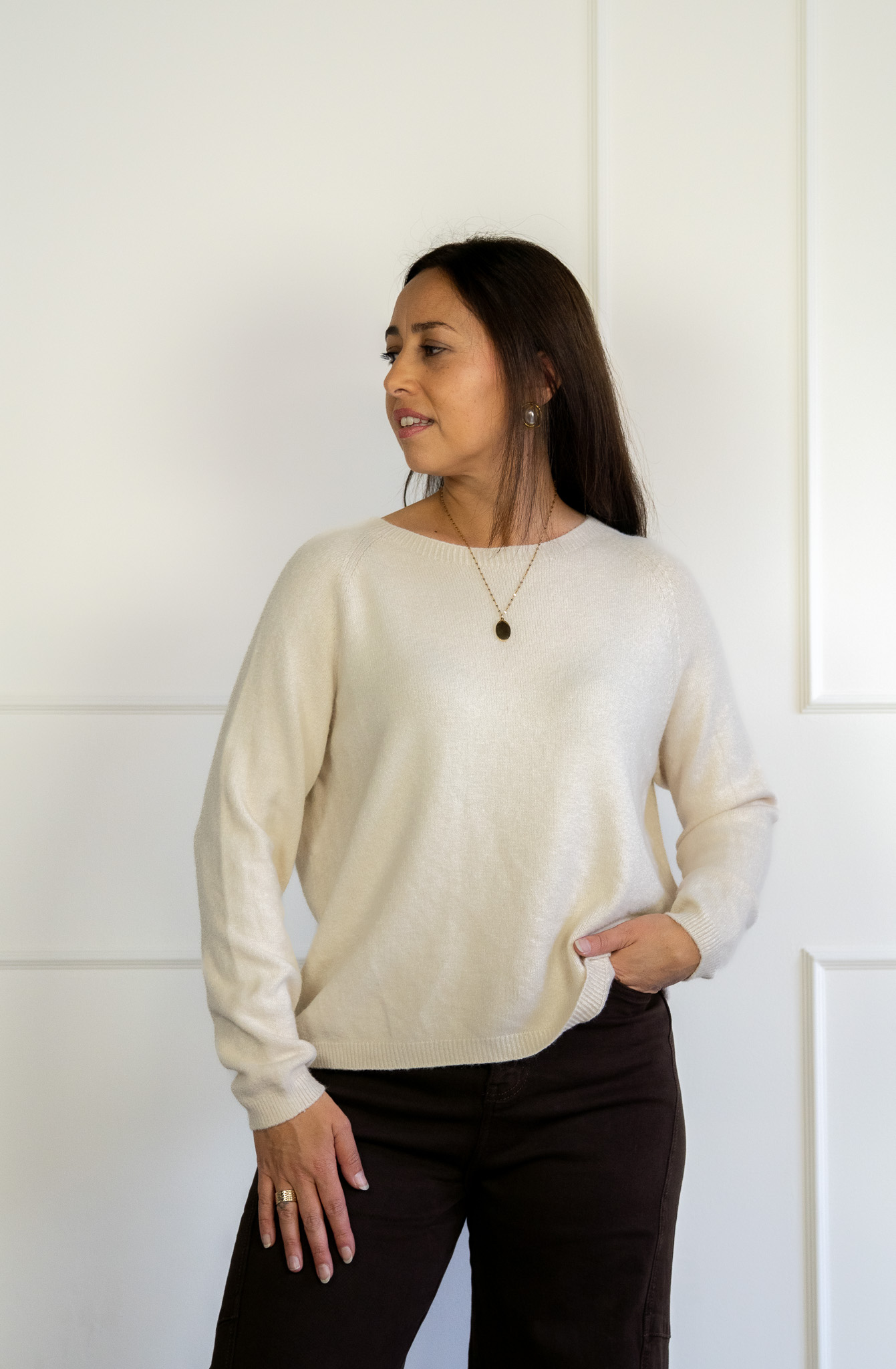 Nola Trui Creme is een fijn gebreide trui  in de kleur Creme. De trui heeft een ronde hals en een losvallende pasvorm. De Nola  trui is ook verkrijgbaar in meerdere kleuren.
