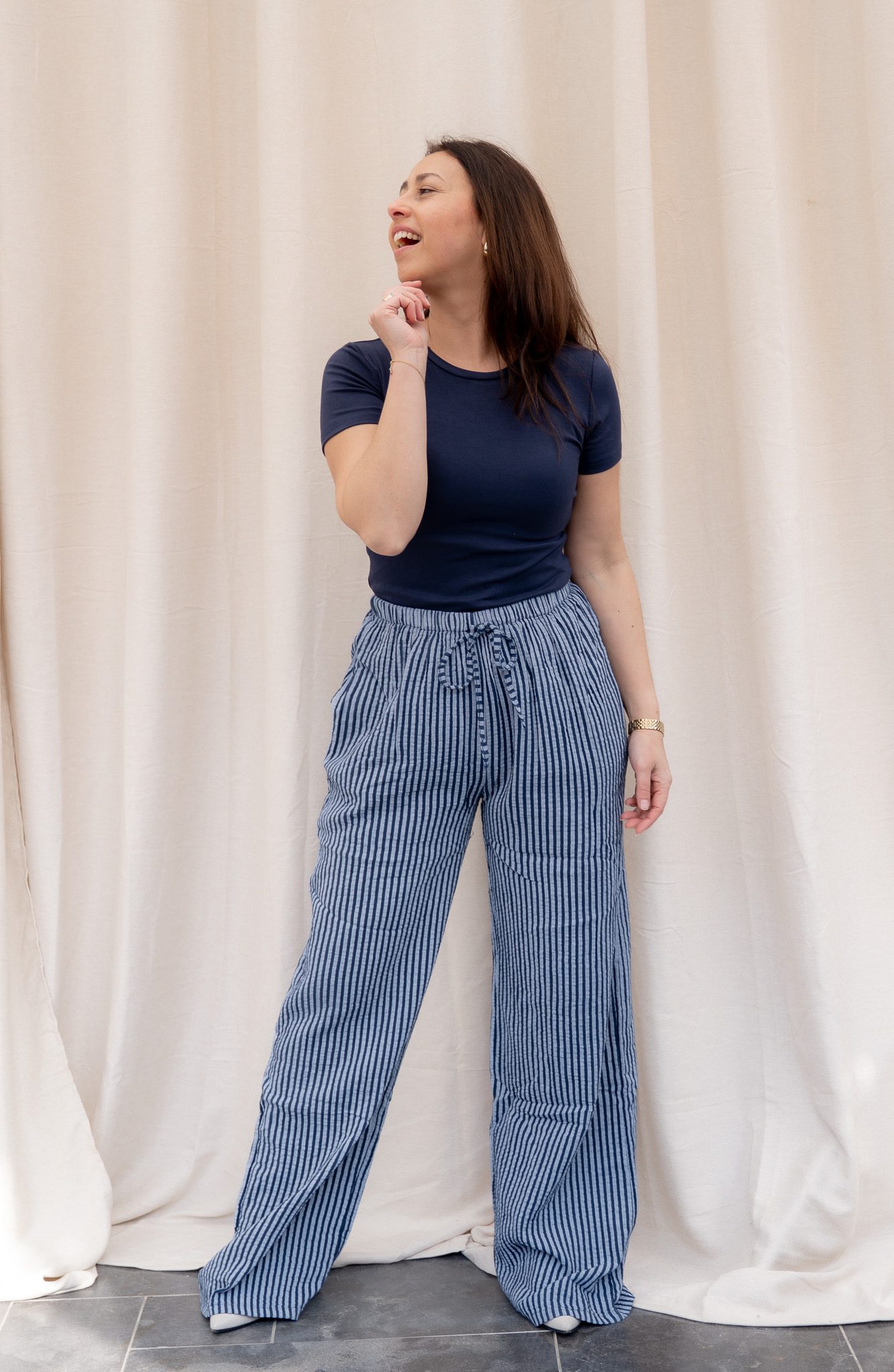 De Pearl broek is een super comfortabele broek met een elastische tailleband en strikkoord. De broek heeft een wijde fit en draagt heerlijk door de soepele katoenen stof. Combineer de broek met een losvallende trui of trendy T-Shirt voor een stoere uitstraling. De broek is er in 3 kleuren, Groen, blauw en beige.