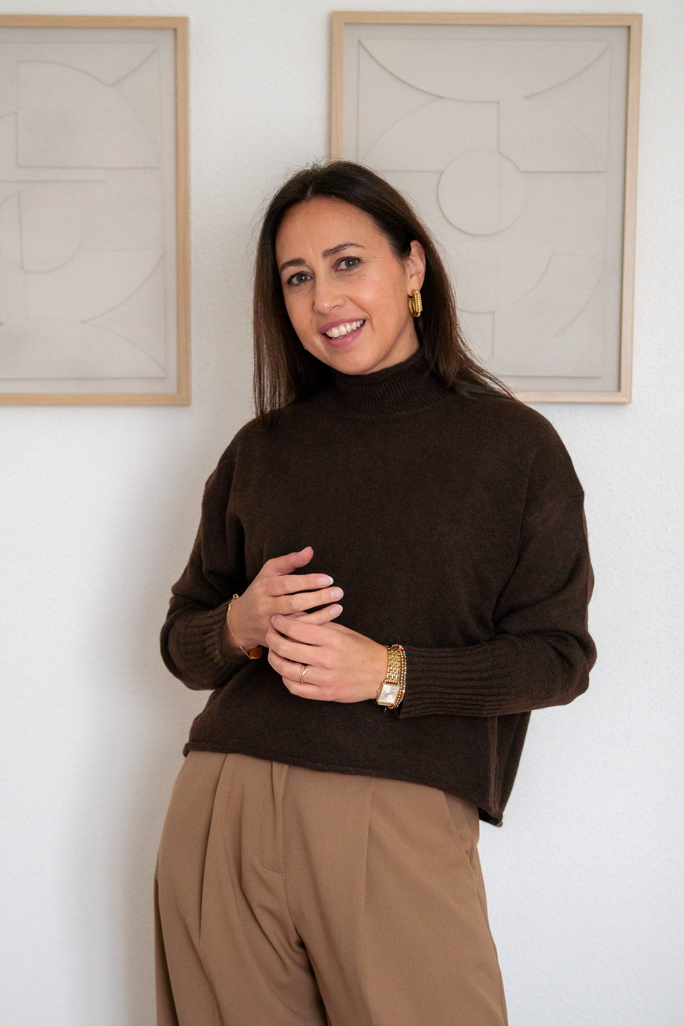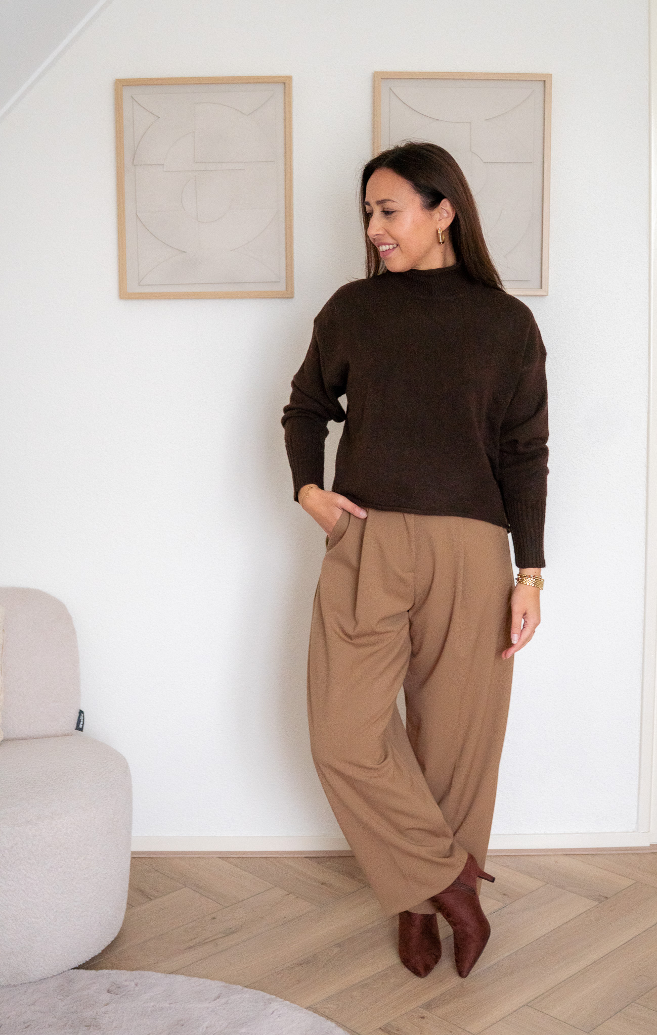 Deze zachte trui combineert warmte, stijl en comfort. Het kortere model geeft een moderne, speelse uitstraling, terwijl de kol zorgt voor een cozy en verfijnde look. Verkrijgbaar in drie prachtige kleuren — wit, bordeaux en bruin — die moeiteloos te combineren zijn met elke outfit.