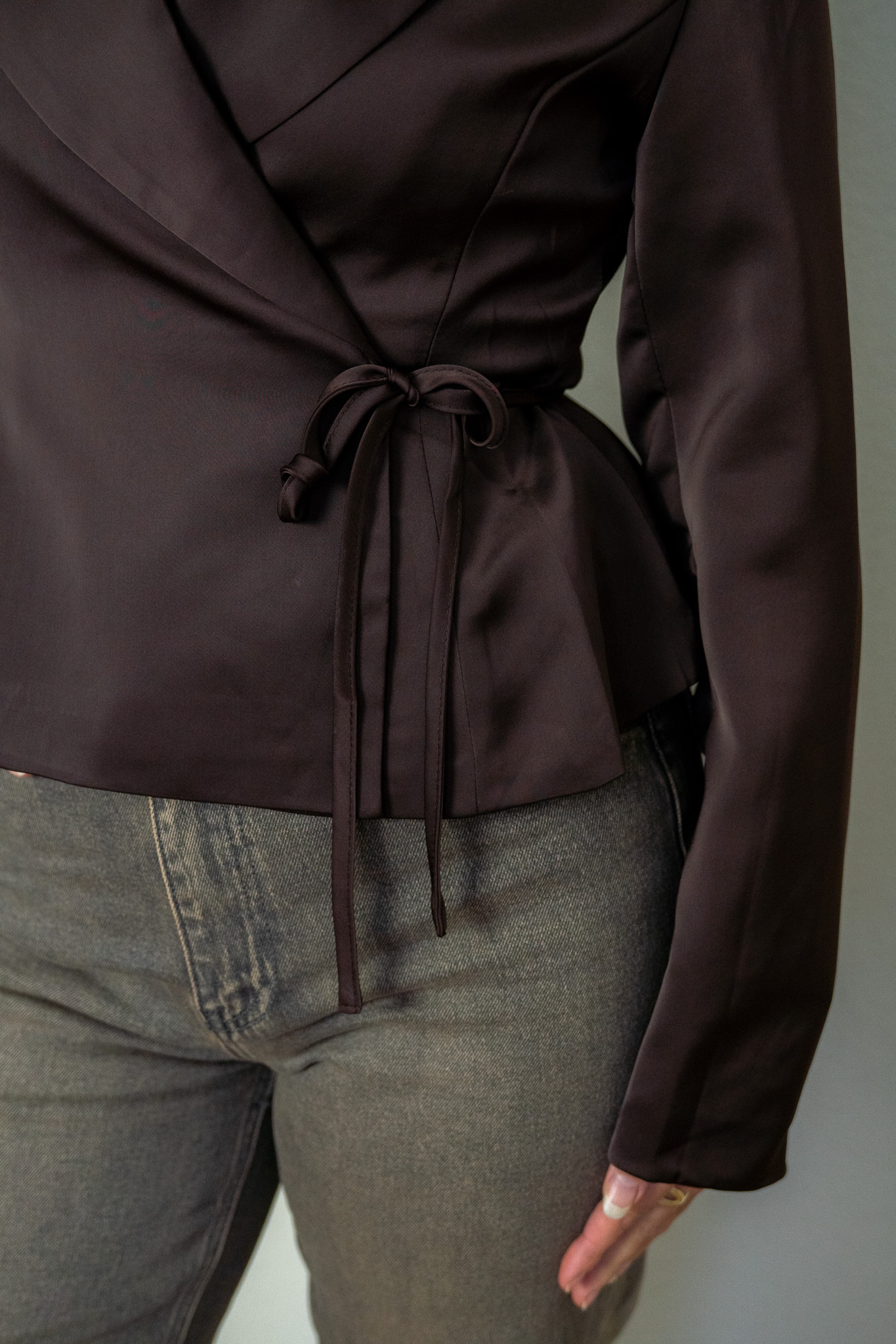 De Roos Blazer van She Clothes straalt pure elegantie uit. Uitgevoerd in een diepe, warme bruintint en gemaakt van een subtiel glanzende stof die een luxe uitstraling geeft. De blazer heeft een elegante overslag met striksluiting aan de zijkant, waardoor de taille mooi wordt geaccentueerd.