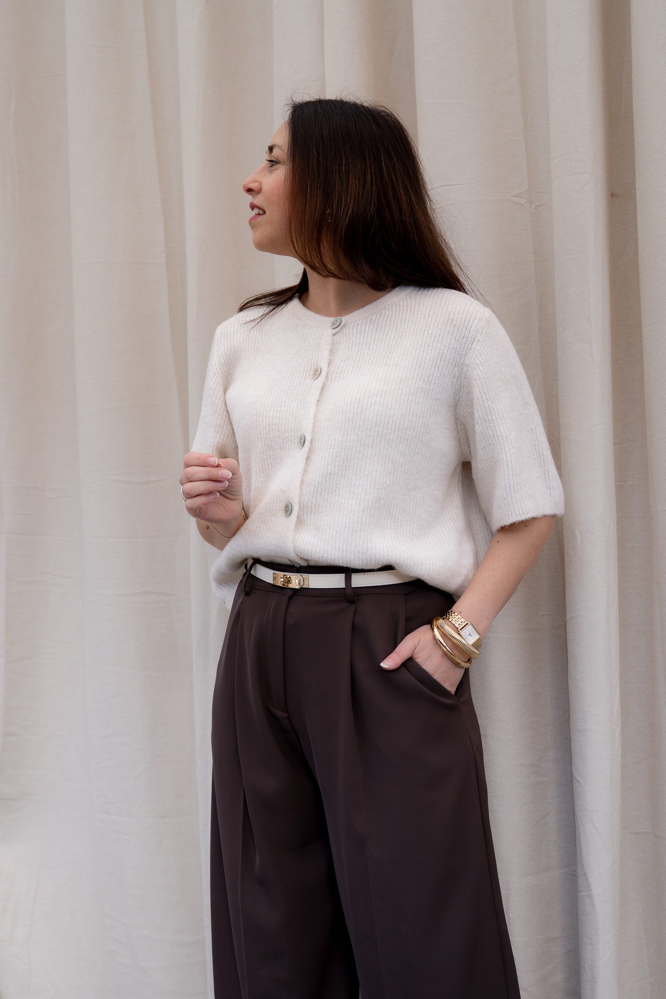 Je draagt de Lina gesloten als top of open over een basic. Combineer ’m met een jeans, pantalon of rokje.