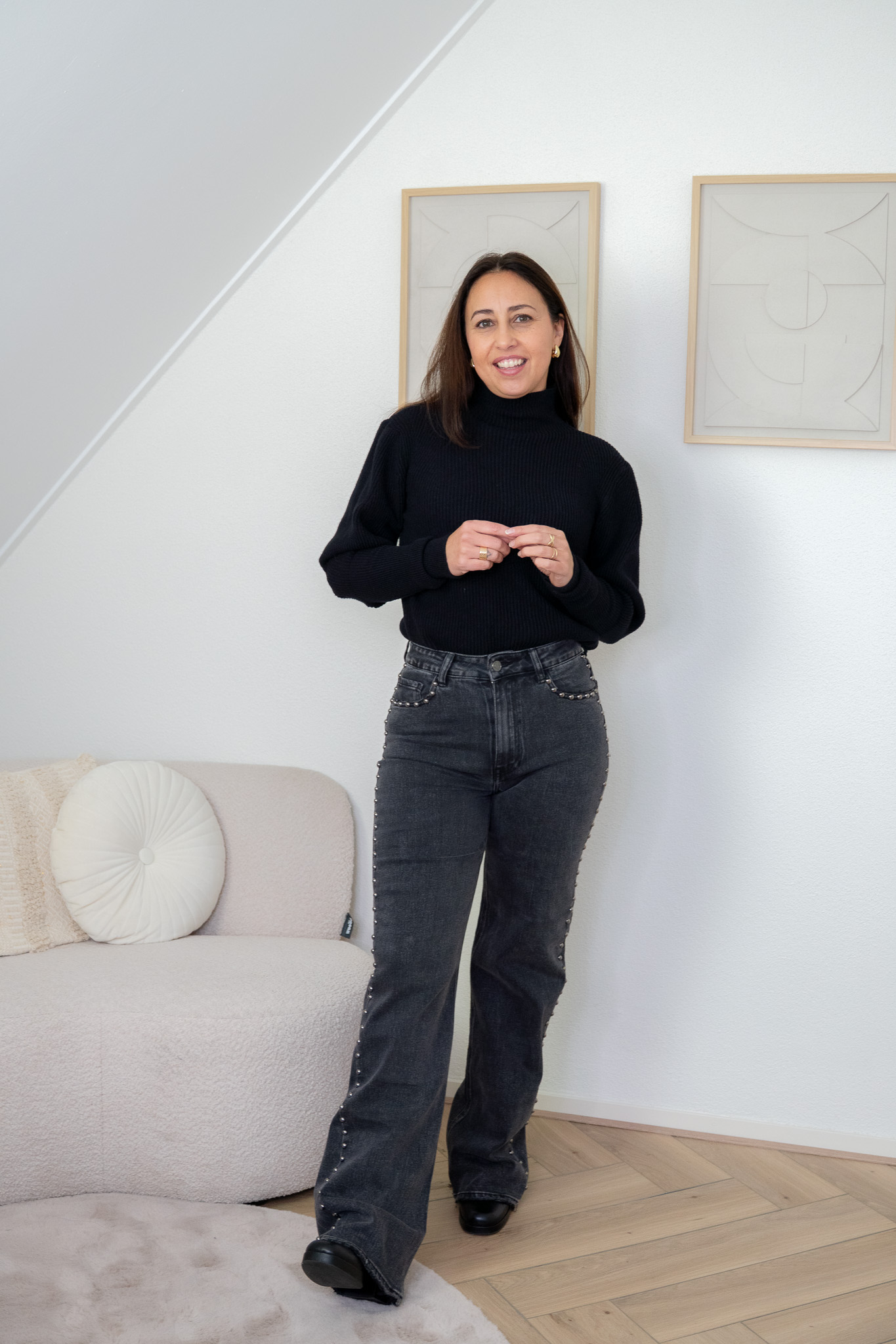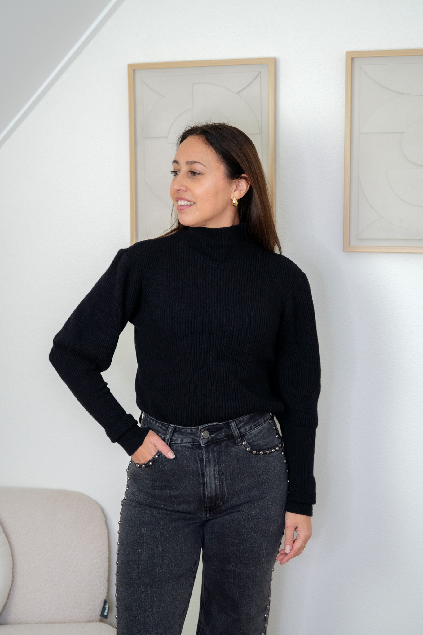 SC Nouk Trui Zwart van she clothes is een gebreide trui in de kleur zwart. De trui heeft een aansluitend model en een hoge hals. De Nouk Trui heeft gepofte mouwen en sluit vanaf de elleboog weer mooi aan.