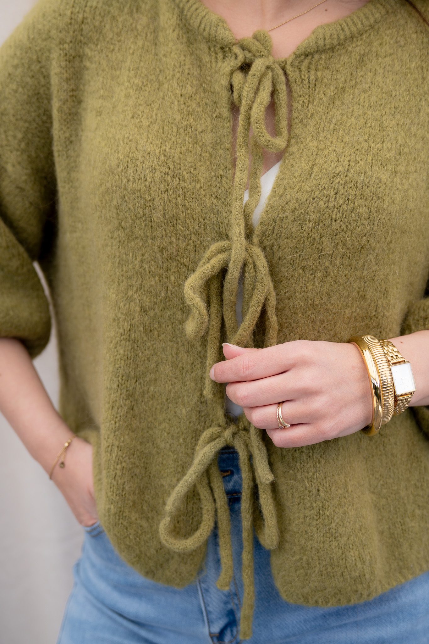 Het Xelly vest heeft een ruimvallend model met halflange, wijde mouwen. De openvallende voorkant met striksluitingen zorgt voor een losse en nonchalante fit die mooi om het lichaam valt.