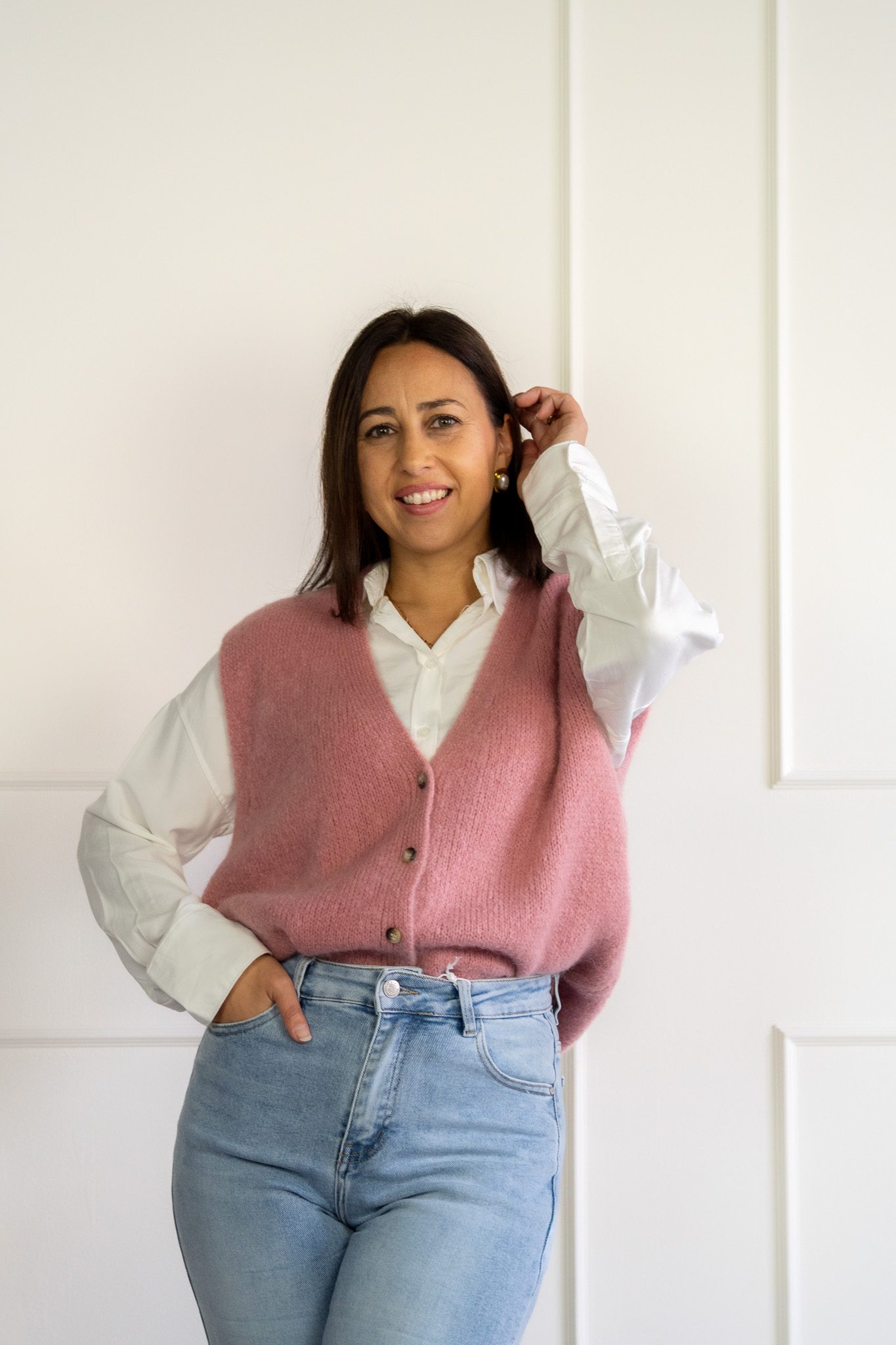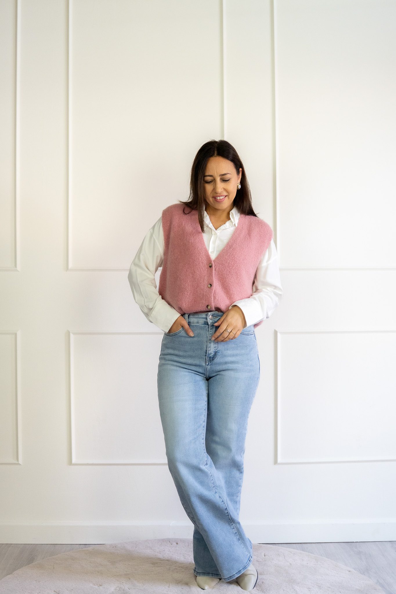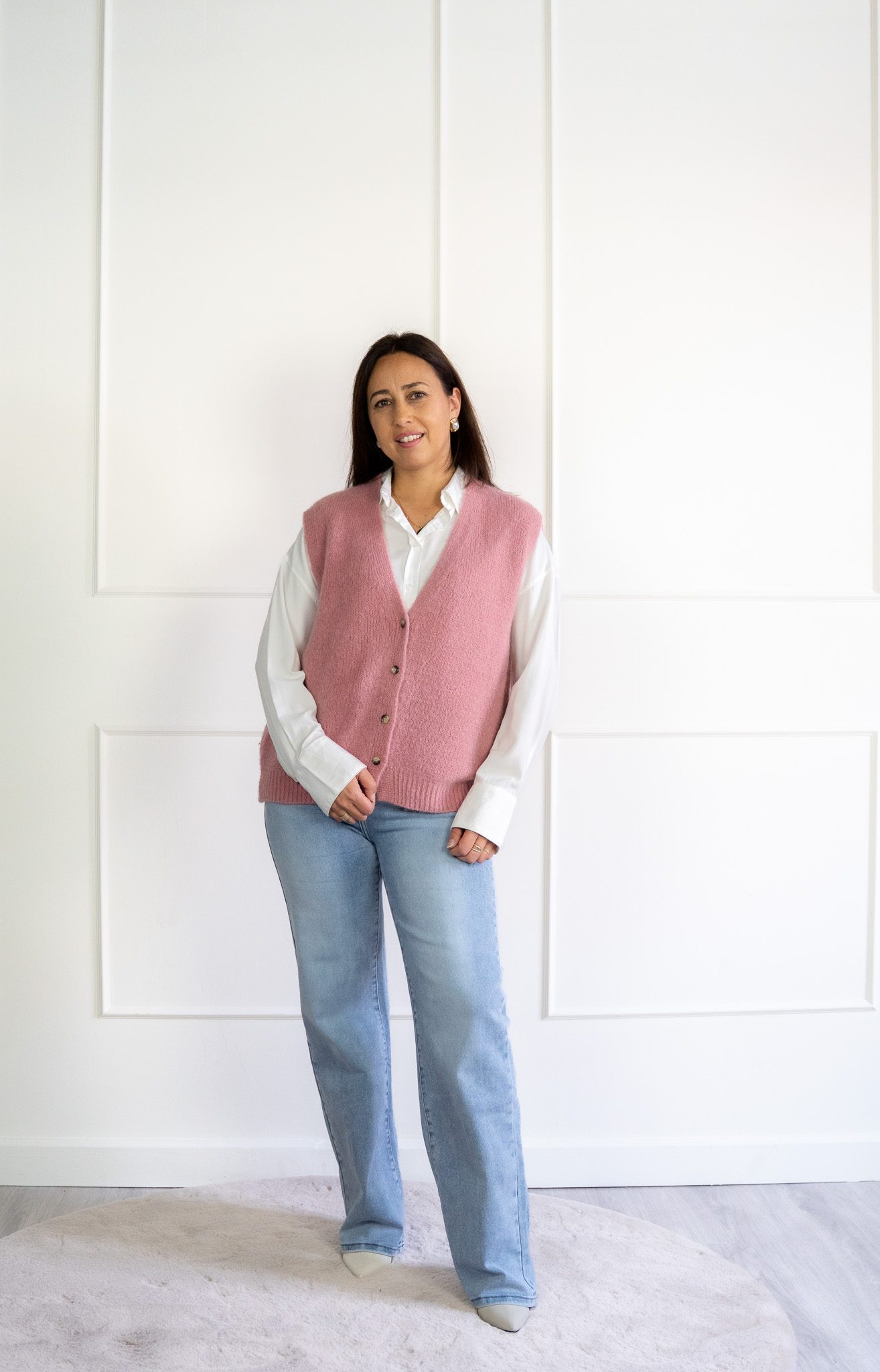 Zora Gilet Roze van She Clothes is een mooi gebreid gilet zonder mouwen. De gilet heeft een knoopjes sluiting waardoor je hem zowel  open als dicht kan dragen over een top. Het gilet heeft een V- hals en heeft een losvallend model.